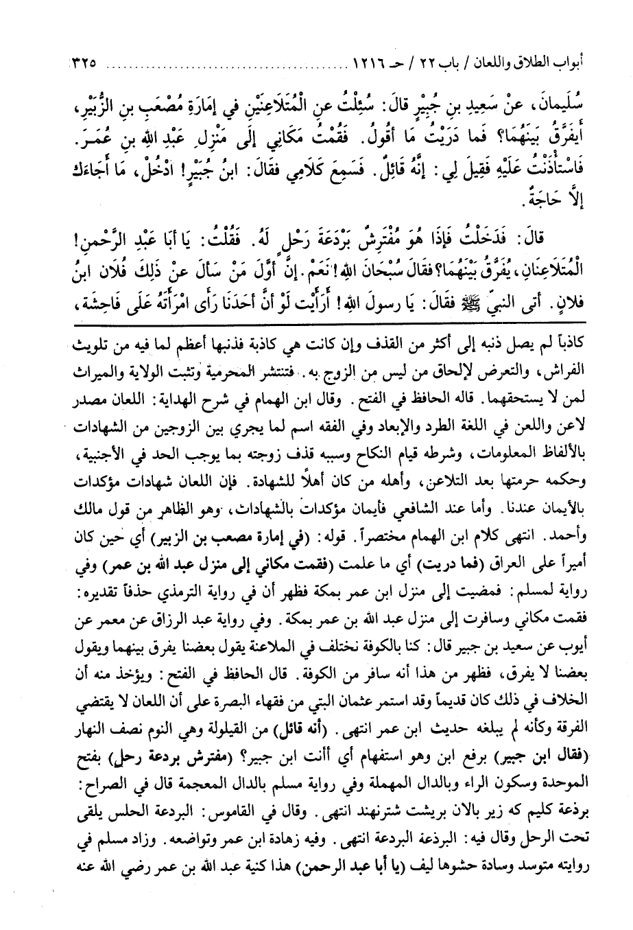قَالَ الْحَافِظُ فِي الْفَتْحِ وَيُؤْخَذُ مِنْهُ أَنَّ الْخِلَافَ فِي ذَلِكَ كَانَ قَدِيمًا وَقَدِ اسْتَمَرَّ عُثْمَانُ الْبَتِّيُّ مِنْ فُقَهَاءِ الْبَصْرَةِ عَلَى أَنَّ اللِّعَانَ لَا يَقْتَضِي الْفُرْقَةَ وكأنه لم يبلغه حديث بن عُمَرَ انْتَهَى (أَنَّهُ قَائِلٌ) مِنَ الْقَيْلُولَةِ وَهِيَ النوم نصف النهار (فقال بن جبير) برفع بن وهو استفهام أي أأنت بن جُبَيْرٍ (مُفْتَرِشٌ بَرْدَعَةَ رَحْلٍ) بِفَتْحِ الْمُوَحَّدَةِ وَسُكُونِ الرَّاءِ وَبِالدَّالِ الْمُهْمَلَةِ وفِي رِوَايَةِ مُسْلِمٍ بِالدَّالِ الْمُعْجَمَةِ قَالَ فِي الصُّرَاحِ برذعة كَليم كَه زير بالان بريشت شترنهند انْتَهَى