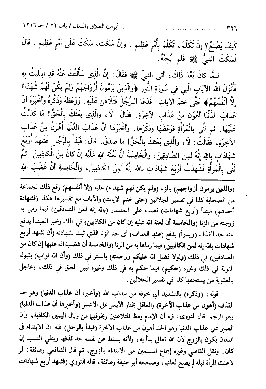 (والذين يرمون أزواجهم) بالزنى (ولم يكن لهم شهداء) عليه (إلا أنفسهم) وَقَعَ ذَلِكَ لِجَمَاعَةٍ مِنَ الصَّحَابَةِ كَذَا فِي تَفْسِيرِ الْجَلَالَيْنِ (حَتَّى خَتَمَ الْآيَاتِ) وَالْآيَاتُ مَعَ تفسيرها هكذا (فشهادة أحدهم) مبتدأ (أربع شهادات) نُصِبَ عَلَى الْمَصْدَرِ (بِاللَّهِ إِنَّهُ لَمِنَ الصَّادِقِينَ) فيما رمي به من زوجته من الزنى (وَالْخَامِسَةُ أَنَّ لَعْنَةَ اللَّهِ عَلَيْهِ إِنْ كَانَ من الكاذبين) فِي ذَلِكَ وَخَبَرُ الْمُبْتَدَأِ يُدْفَعُ عِنْدَ حَدِّ الْقَذْفِ (وَيَدْرَأُ) يَدْفَعُ (عَنْهَا الْعَذَابَ) أَيْ حَدَّ الزنى الَّذِي ثَبَتَ بِشَهَادَاتِهِ (أَنْ تَشْهَدَ أَرْبَعَ شَهَادَاتٍ بالله إنه لمن الكاذبين) فيما رماها به من الزنى (وَالْخَامِسَةَ أَنَّ غَضَبَ اللَّهِ عَلَيْهَا إِنْ كَانَ من الصادقين) فِي ذَلِكَ (وَلَوْلَا فَضْلُ اللَّهِ عَلَيْكُمْ وَرَحْمَتُهُ) بالستر في ذلك (وأن الله تواب) بِقَبُولِهِ التَّوْبَةَ فِي ذَلِكَ وَغَيْرِهِ (حَكِيمٌ) فِيمَا حَكَمَ بِهِ فِي ذَلِكَ وَغَيْرِهِ لَبَيَّنَ الْحَقَّ فِي ذَلِكَ وَعَاجَلَ بِالْعُقُوبَةِ مَنْ يَسْتَحِقُّهَا كَذَا فِي تَفْسِيرِ الْجَلَالَيْنِ