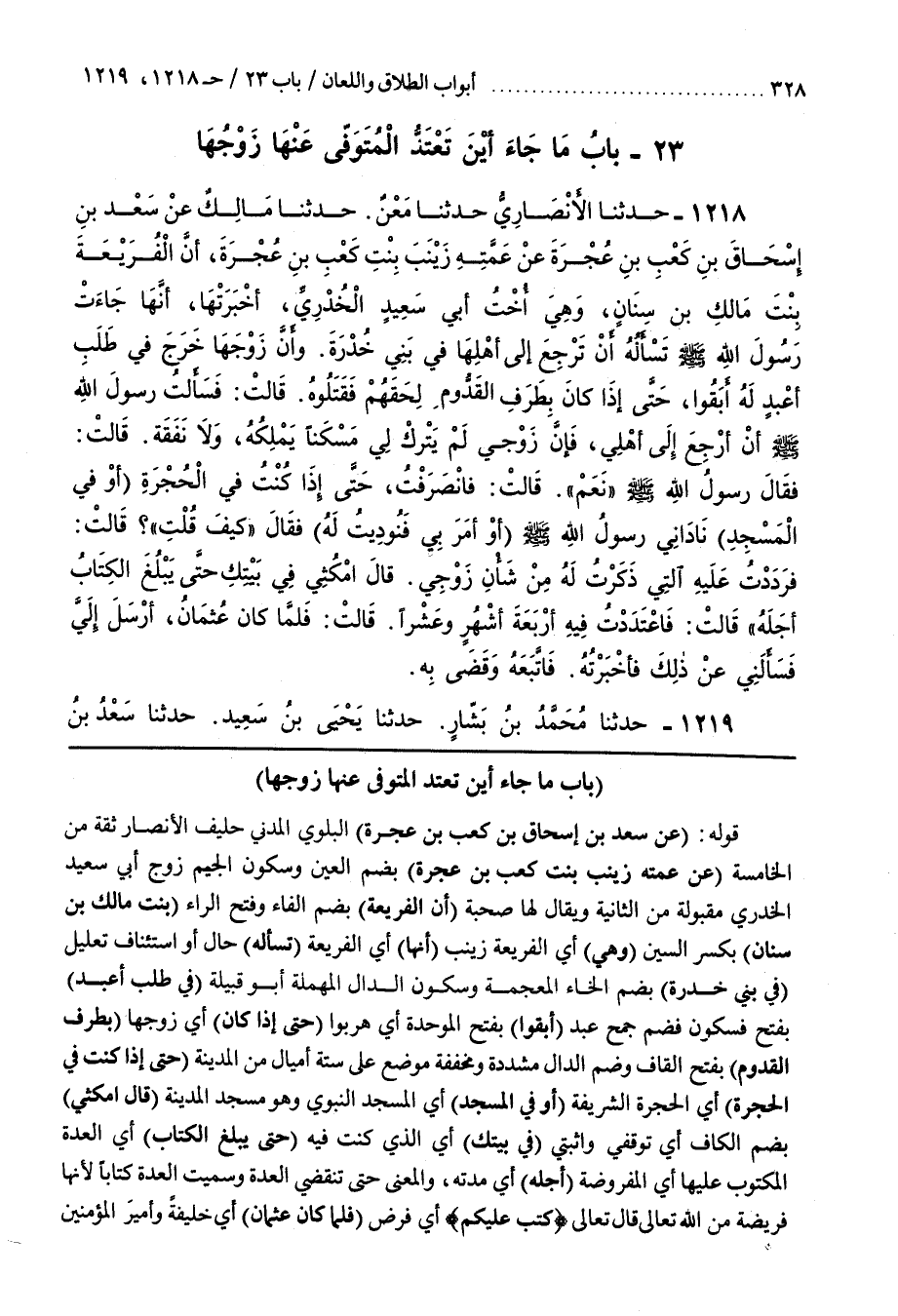 [1204] قَوْلُهُ (عَنْ سَعْدِ بْنِ إِسْحَاقَ بْنِ كَعْبِ بْنِ عُجْرَةَ) الْبَلَوِيِّ الْمَدَنِيِّ حَلِيفِ الْأَنْصَارِ ثِقَةٌ مِنَ الْخَامِسَةِ (عَنْ عَمَّتِهِ زَيْنَبَ بِنْتِ كَعْبِ بْنِ عُجْرَةَ) بِضَمِّ الْعَيْنِ وَسُكُونِ الْجِيمِ زَوْجِ أَبِي سَعِيدٍ الْخُدْرِيِّ مَقْبُولَةٌ مِنَ الثَّانِيَةِ وَيُقَالُ لَهَا صُحْبَةٌ (أَنَّ الْفُرَيْعَةَ) بِضَمِّ الْفَاءِ وَفَتْحِ الرَّاءِ (بِنْتَ مَالِكِ بْنِ سِنَانٍ) بِكَسْرِ السِّينِ (وَهِيَ) أَيْ الْفُرَيْعَةُ زَيْنَبُ (أَنَّهَا) أَيْ الْفُرَيْعَةُ (تَسْأَلُهُ) حَالٌ أَوِ اسْتِئْنَافُ تَعْلِيلٍ (فِي بَنِي خُدْرَةَ) بِضَمِّ الْخَاءِ الْمُعْجَمَةِ وَسُكُونِ الدَّالِ الْمُهْمَلَةِ أَبُو قَبِيلَةٍ (فِي طَلَبِ أَعْبُدٍ) بِفَتْحٍ فَسُكُونٍ فَضَمٍّ جَمْعُ عَبْدٍ (أَبَقُوا) بِفَتْحِ الْمُوَحَّدَةِ أَيْ هَرَبُوا (حَتَّى إِذَا كَانَ) أَيْ زَوْجُهَا (بِطَرَفِ الْقَدُومِ) بِفَتْحِ الْقَافِ وَضَمِّ الدَّالِ مُشَدَّدَةٌ وَمُخَفَّفَةٌ مَوْضِعٌ عَلَى سِتَّةِ أَمْيَالٍ مِنَ الْمَدِينَةِ (حَتَّى إِذَا كُنْتُ فِي الْحُجْرَةِ) أَيْ الْحُجْرَةِ الشَّرِيفَةِ (أَوْ فِي الْمَسْجِدِ) أَيْ الْمَسْجِدِ النَّبَوِيِّ وَهُوَ مَسْجِدُ الْمَدِينَةِ (قَالَ امْكُثِي) بِضَمِّ الْكَافِ أَيْ تَوَقَّفِي وَاثْبُتِي (فِي بَيْتِكِ) أَيْ الَّذِي كُنْتِ فِيهِ (حَتَّى يَبْلُغَ الْكِتَابُ) أَيْ الْعِدَّةُ الْمَكْتُوبُ عَلَيْهَا أَيْ الْمَفْرُوضَةُ (أَجَلَهُ) أَيْ مُدَّتَهُ وَالْمَعْنَى حَتَّى تَنْقَضِيَ الْعِدَّةُ وَسُمِّيَتِ الْعِدَّةُ كِتَابًا لِأَنَّهَا فَرِيضَةٌ مِنَ اللَّهِ تَعَالَى قَالَ تَعَالَى كُتِبَ عَلَيْكُمْ أَيْ فُرِضَ (فَلَمَّا كَانَ عُثْمَانُ) أَيْ خَلِيفَةً وَأَمِيرَ الْمُؤْمِنِين