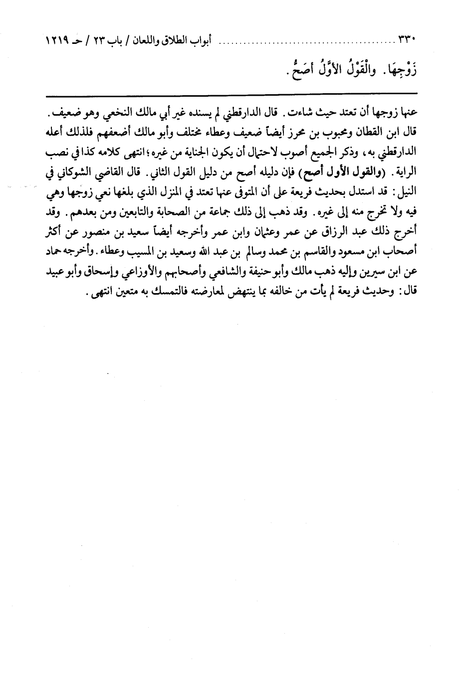 وأَخْرَجَهُ حَمَّادٌ عن بن سِيرِينَ وَإِلَيْهِ ذَهَبَ مَالِكٌ وَأَبُو حَنِيفَةَ وَالشَّافِعِيُّ وَأَصْحَابُهُمْ وَالْأَوْزَاعِيُّ وَإِسْحَاقُ وَأَبُو عُبَيْدٍ قَالَ وَحَدِيثُ فُرَيْعَةَ لَمْ يَأْتِ مَنْ خَالَفَهُ بِمَا يَنْتَهِضُ لمعارضته فالتمسك به متعين انتهى