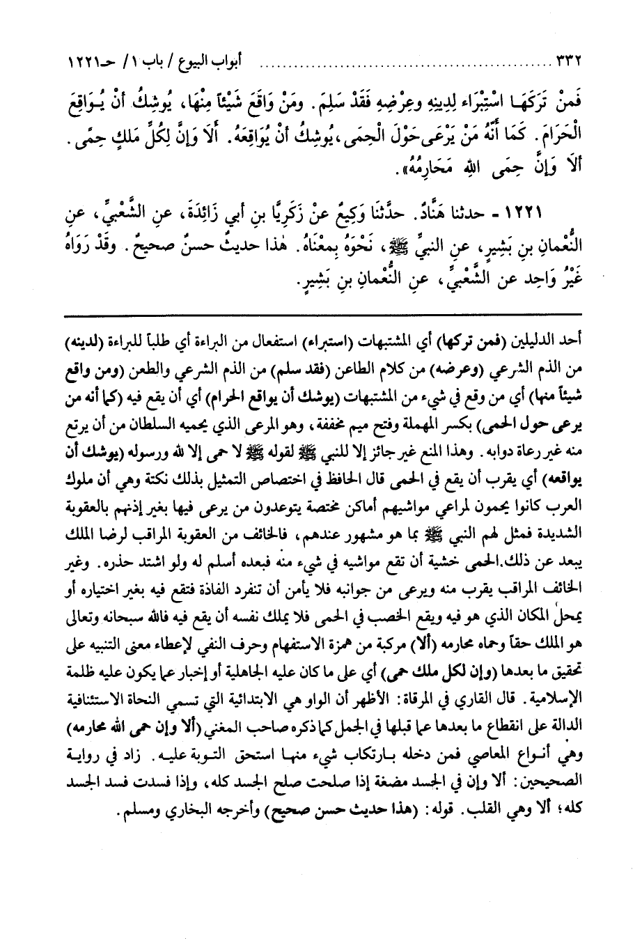 أَحَدِ الدَّلِيلَيْنِ (فَمَنْ تَرَكَهَا) أَيْ الْمُشْتَبِهَاتِ (اسْتِبْرَاءً) اسْتِفْعَالٌ مِنَ الْبَرَاءَةِ أَيْ طَلَبًا لِلْبَرَاءَةِ (لِدِينِهِ) مِنَ الذَّمِّ الشَّرْعِيِّ (وَعِرْضِهِ) مِنْ كَلَامِ الطَّاعِنِ (فَقَدْ سَلِمَ) مِنَ الذَّمِّ الشَّرْعِيِّ وَالطَّعْنِ (وَمَنْ وَاقَعَ شَيْئًا مِنْهَا) أَيْ مَنْ وَقَعَ فِي شَيْءٍ مِنَ الْمُشْتَبِهَاتِ (يُوشِكُ أَنْ يُوَاقِعَ الْحَرَامَ) أَيْ أَنْ يَقَعَ فِيهِ (كَمَا أَنَّهُ مَنْ يَرْعَى حَوْلَ الْحِمَى) بِكَسْرِ الْمُهْمَلَةِ وَفَتْحِ مِيمٍ مُخَفَّفَةٍ وَهُوَ الْمَرْعَى الَّذِي يَحْمِيهِ السُّلْطَانُ مِنْ أَنْ يَرْتَعَ مِنْهُ غَيْرُ رُعَاةِ دَوَابِّهِ
