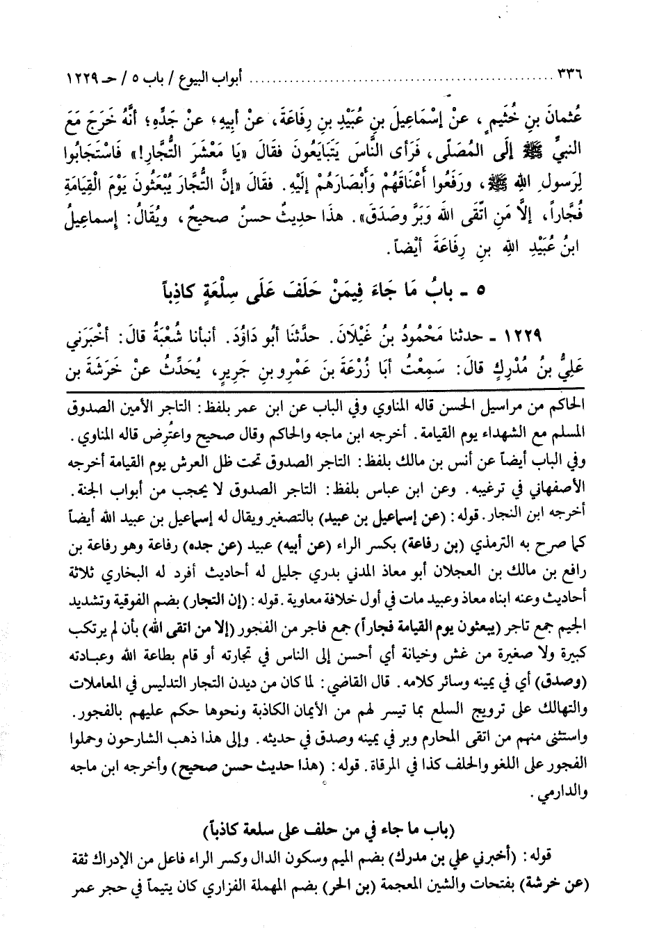 [1210] قَوْلُهُ (عَنْ إِسْمَاعِيلَ بْنِ عُبَيْدِ) بِالتَّصْغِيرِ وَيُقَالُ لَهُ إِسْمَاعِيلُ بْنُ عُبَيْدِ اللَّهِ أَيْضًا كَمَا صَرَّحَ بِهِ التِّرْمِذِيُّ (بْنِ رِفَاعَةَ) بِكَسْرِ الرَّاءِ (عَنْ أَبِيهِ) عُبَيْدٍ (عَنْ جَدِّهِ) رِفَاعَةَ وَهُوَ رِفَاعَةَ بْنِ رَافِعِ بْنِ مَالِكِ بْنِ الْعَجْلَانِ أَبُو مُعَاذٍ الْمَدَنِيُّ بَدْرِيٌّ جَلِيلٌ لَهُ أحاديث انفرد لَهُ الْبُخَارِيُّ ثَلَاثَةَ أَحَادِيثَ وَعَنْهُ ابْنَاهُ مُعَاذٌ وَعُبَيْدٌ مَاتَ فِي أَوَّلِ خِلَافَةِ مُعَاوِيَةَ قَوْلُهُ (إِنَّ التُّجَّارَ) بِضَمِّ الْفَوْقِيَّةِ وَتَشْدِيدِ الْجِيمِ جَمْعُ تَاجِرٍ (يُبْعَثُونَ يَوْمَ الْقِيَامَةِ فُجَّارًا) جَمْعُ فَاجِرٍ مِنَ الْفُجُورِ (إِلَّا مَنِ اتَّقَى اللَّهَ) بِأَنْ لَمْ يَرْتَكِبْ كَبِيرَةً وَلَا صَغِيرَةً مِنْ غِشٍّ وَخِيَانَةٍ أَيْ أَحْسَنَ إِلَى النَّاسِ فِي تِجَارَتِهِ أَوْ قَامَ بِطَاعَةِ اللَّهِ وَعِبَادَتِهِ (وَصَدَقَ) أَيْ فِي يَمِينِهِ وَسَائِرِ كَلَامِهِ