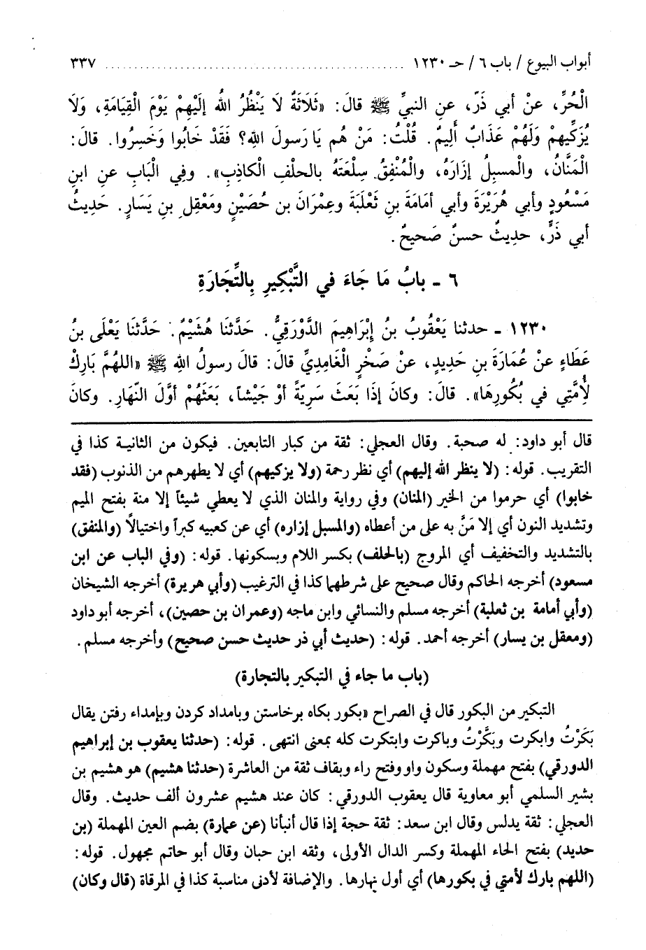 قَوْلُهُ (لَا يَنْظُرُ اللَّهُ إِلَيْهِمْ) أَيْ نَظَرَ رَحْمَةٍ (وَلَا يُزَكِّيهِمْ) أَيْ لَا يُطَهِّرُهُمْ مِنَ الذُّنُوبِ (فَقَدْ خَابُوا) أَيْ حُرِمُوا مِنَ الْخَيْرِ (الْمَنَّانُ) وفِي رِوَايَةٍ وَالْمَنَّانُ الَّذِي لَا يُعْطِي شَيْئًا إِلَّا مَنَّةً بِفَتْحِ الْمِيمِ وَتَشْدِيدِ النُّونِ أَيْ إِلَّا مَنَّ بِهِ عَلَى مَنْ أَعْطَاهُ (وَالْمُسْبِلُ إِزَارَهُ) أَيْ عَنْ كَعْبَيْهِ كِبْرًا وَاخْتِيَالًا (وَالْمُنْفِقُ) بِالتَّشْدِيدِ وَالتَّخْفِيفِ أَيْ الْمُرَوِّجُ (بِالْحَلِفِ) بِكَسْرِ اللَّامِ وَبِسُكُونِهَا قَوْلُهُ (وفِي الباب عن بن مَسْعُودٍ) أَخْرَجَهُ الْحَاكِمُ وَقَالَ صَحِيحٌ عَلَى شَرْطِهِمَا كَذَا فِي التَّرْغِيبِ (وَأَبِي هُرَيْرَةَ) أَخْرَجَهُ الشَّيْخَانِ (وَأَبِي أُمَامَةَ بْنِ ثَعْلَبَةَ) أَخْرَجَهُ مُسْلِمٌ وَالنَّسَائِيُّ وبن مَاجَهْ (وَعِمْرَانَ بْنِ حُصَيْنٍ) أَخْرَجَهُ أَبُو دَاوُدَ (وَمَعْقِلِ بْنِ يَسَارٍ) أَخْرَجَهُ أَحْمَدُ