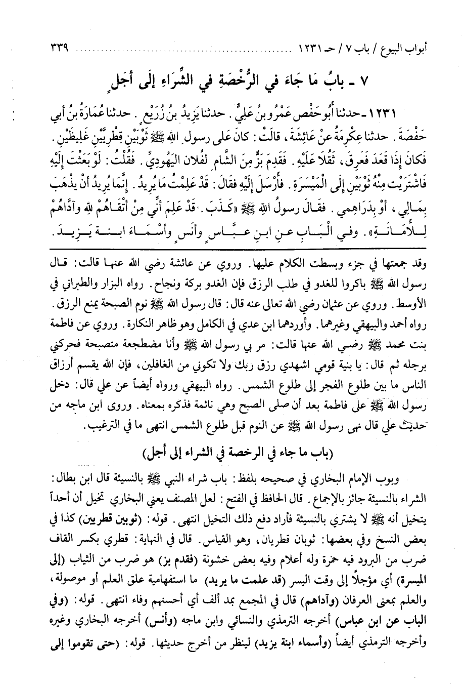 وَبَوَّبَ الْإِمَامُ الْبُخَارِيُّ فِي صَحِيحِهِ بِلَفْظِ بَابُ شِرَاءِ النَّبِيِّ صَلَّى اللَّهُ عَلَيْهِ وسلم بالنسيئة قال بن بَطَّالٍ الشِّرَاءُ بِالنَّسِيئَةِ جَائِزٌ بِالْإِجْمَاعِ