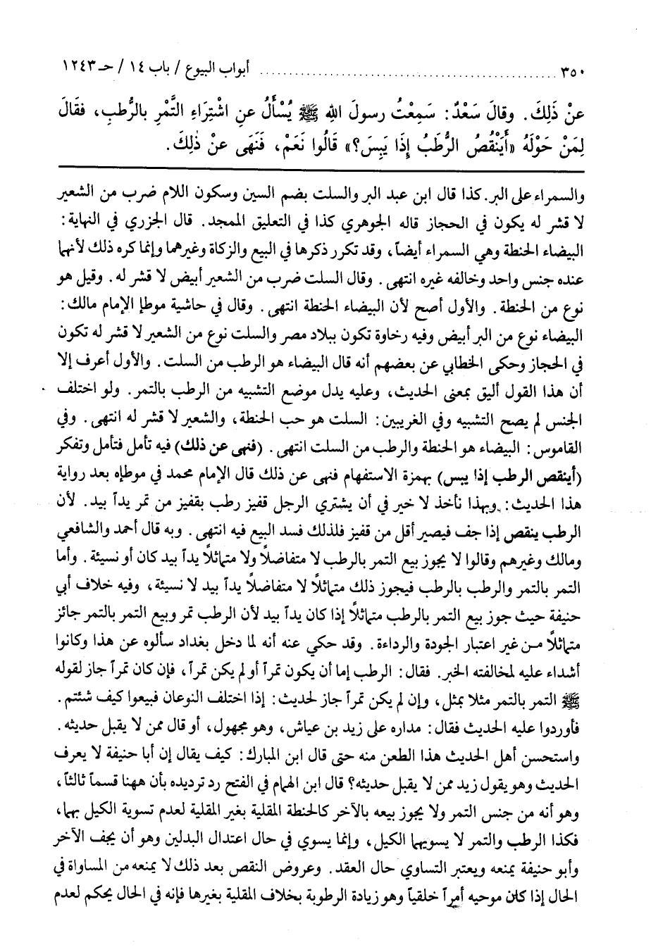 واسْتَحْسَنَ أَهْلُ الْحَدِيثِ هَذَا الطَّعْنَ مِنْهُ حتى قال بن الْمُبَارَكِ كَيْفَ يُقَالُ إِنَّ أَبَا حَنِيفَةَ لَا يَعْرِفُ الْحَدِيثَ وَهُوَ يَقُولُ زَيْدٌ مِمَّنْ لَا يقبل حديثه قال بن الهمام في الفتح رد ترديده بأن ها هنا قِسْمًا ثَالِثًا وَهُوَ أَنَّهُ مِنْ جِنْسِ التَّمْرِ وَلَا يَجُوزُ بَيْعُهُ بِالْآخَرِ كَالْحِنْطَةِ الْمَقْلِيَّةِ بِغَيْرِ الْمَقْلِيَّةِ لِعَدَمِ تَسْوِيَةِ الْكَيْلِ بِهِمَا فَكَذَا الرُّطَبُ وَالتَّمْرُ لَا يُسَوِّيهِمَا الْكَيْلُ وَإِنَّمَا يُسَوِّي فِي حَالِ اعْتِدَالِ الْبَدَلَيْنِ وَهُوَ أَنْ يَجِفَّ الْآخَرُ وَأَبُو حَنِيفَةَ يَمْنَعُهُ وَيَعْتَبِرُ التَّسَاوِي حَالَ الْعَقْدِ