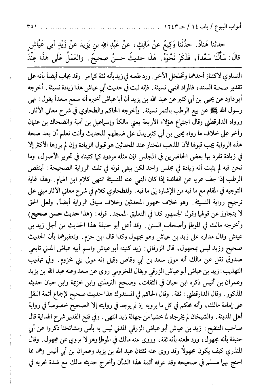 ورَوَاهُ الدَّارَقُطْنِيُّ وَقَالَ اجْتِمَاعُ هَؤُلَاءِ الْأَرْبَعَةِ يَعْنِي مَالِكًا وَإِسْمَاعِيلَ بْنَ أُمَيَّةَ وَالضَّحَّاكَ بْنَ عُثْمَانَ وَآخَرَ عَلَى خِلَافِ مَا رَوَاهُ يَحْيَى بْنُ أَبِي كَثِيرٍ يَدُلُّ عَلَى ضَبْطِهِمْ لِلْحَدِيثِ وَأَنْتَ تَعْلَمُ أَنْ بَعْدَ صِحَّةِ هَذِهِ الرِّوَايَةِ يَجِبُ قَبُولُهَا لِأَنَّ الْمَذْهَبَ الْمُخْتَارَ عِنْدَ الْمُحَدِّثِينَ هُوَ قَبُولُ الزِّيَادَةِ وَإِنْ لَمْ يَرْوِهَا الْأَكْثَرُ إِلَّا فِي زِيَادَةٍ تَفَرَّدَ بِهَا بَعْضُ الْحَاضِرِينَ فِي الْمَجْلِسِ فَإِنَّ مِثْلَهُ مَرْدُودٌ كَمَا كَتَبْنَاهُ فِي تَحْرِيرِ الْأُصُولِ وَمَا نَحْنُ فِيهِ لَمْ يَثْبُتْ أَنَّهُ زِيَادَةٌ فِي مَجْلِسٍ وَاحِدٍ لَكِنْ يَبْقَى قَوْلُهُ فِي تِلْكَ الرِّوَايَةِ الصَّحِيحَةِ أَيَنْقُصُ الرُّطَبُ إِذَا جَفَّ عَرِيًّا عَنِ الْفَائِدَةِ إِذَا كَانَ النَّهْيُ عَنْهُ لِلنَّسِيئَةِ انتهى كلام بن الْهُمَامِ