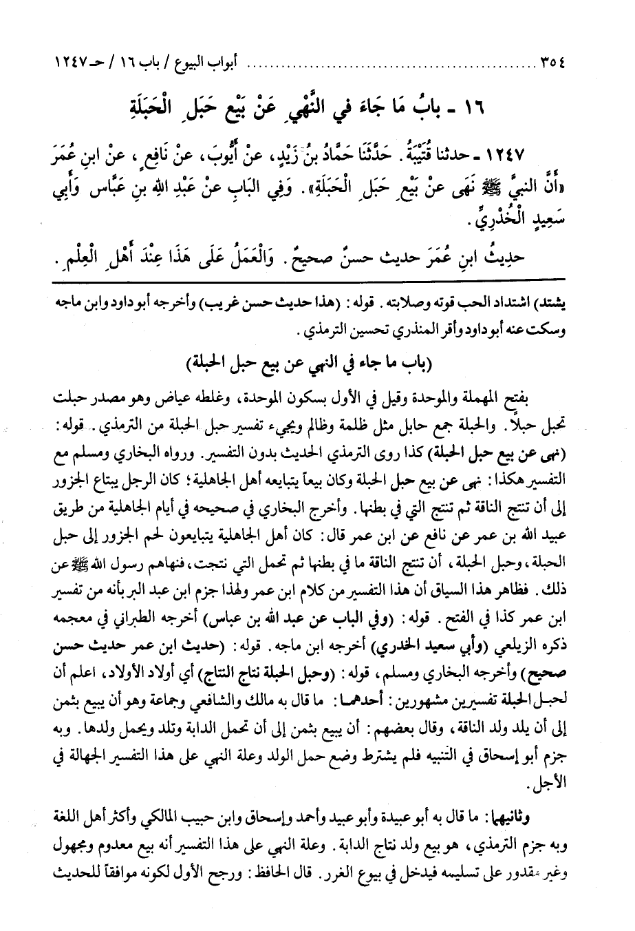 قوله (حديث بن عُمَرَ حَدِيثٌ حَسَنٌ صَحِيحٌ) وَأَخْرَجَهُ الْبُخَارِيُّ وَمُسْلِمٌ قَوْلُهُ (وَحَبَلُ الْحَبَلَةِ نَتَاجُ النَّتَاجِ) أَيْ أَوْلَادُ الْأَوْلَادِ اعْلَمْ أَنَّ لِحَبَلِ الْحَبَلَةِ تَفْسِيرَيْنِ مَشْهُورَيْنِ أَحَدُهُمَا مَا قَالَ بِهِ مَالِكٌ وَالشَّافِعِيُّ وَجَمَاعَةٌ وَهُوَ أَنْ يَبِيعَ بِثَمَنٍ إِلَى أَنْ يَلِدَ وَلَدُ النَّاقَةِ وَقَالَ بَعْضُهُمْ أَنْ يَبِيعَ بِثَمَنٍ إِلَى أَنْ تَحْمِلَ الدَّابَّةُ وَتَلِدَ وَيَحْمِلَ وَلَدُهَا