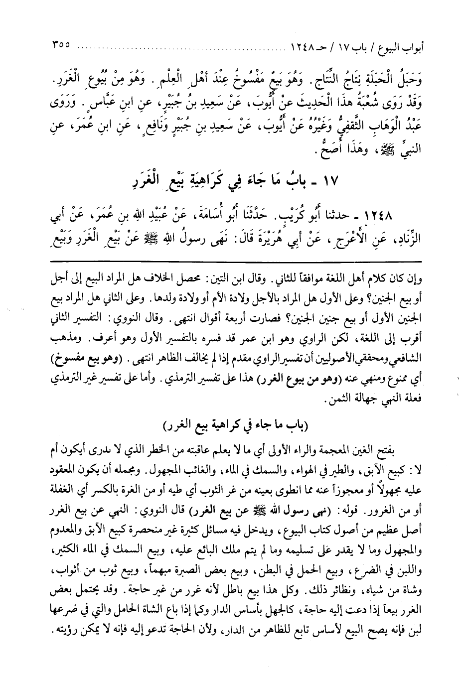 [1230] قَوْلُهُ (نَهَى رَسُولُ اللَّهِ صَلَّى اللَّهُ عَلَيْهِ وَسَلَّمَ عَنْ بَيْعِ الْغَرَرِ) قَالَ النَّوَوِيُّ النَّهْيُ عَنْ بَيْعِ الْغَرَرِ أَصْلٌ عَظِيمٌ مِنْ أُصُولِ كِتَابِ الْبُيُوعِ وَيَدْخُلُ فِيهِ مَسَائِلُ كَثِيرَةٌ غَيْرُ مُنْحَصِرَةٍ كَبَيْعِ الْآبِقِ وَالْمَعْدُومِ وَالْمَجْهُولِ وَمَا لَا يُقْدَرُ عَلَى تَسْلِيمِهِ وَمَا لَمْ يَتِمَّ مِلْكُ الْبَائِعِ عَلَيْهِ وَبَيْعُ السَّمَكِ فِي الْمَاءِ الْكَثِيرِ وَاللَّبَنِ فِي الضَّرْعِ وَبَيْعِ الْحَمْلِ فِي الْبَطْنِ وَبَيْعِ بَعْضِ الصُّبْرَةِ مُبْهَمًا وَبَيْعِ ثَوْبٍ مِنْ أَثْوَابٍ
