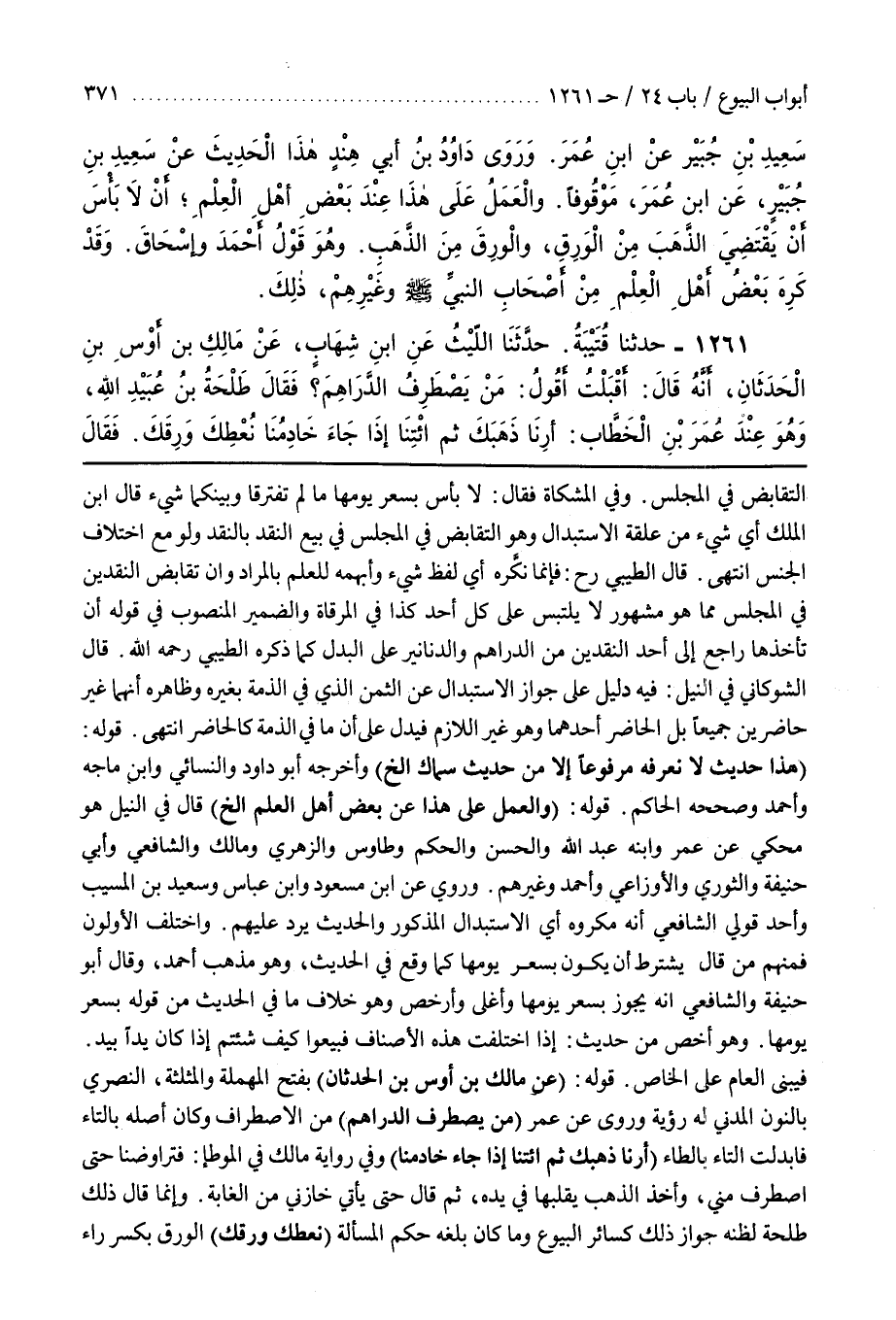 [1243] قَوْلُهُ (عَنْ مَالِكِ بْنِ أَوْسِ بْنِ الْحَدَثَانِ) بِفَتْحِ الْمُهْمَلَةِ وَالْمُثَلَّثَةِ النَّصْرِيِّ بِالنُّونِ الْمَدَنِيِّ لَهُ رُؤْيَةٌ وَرَوَى عَنْ عُمَرَ (مَنْ يَصْطَرِفُ الدَّرَاهِمَ) مِنَ الِاصْطِرَافِ وَكَانَ أَصْلُهُ بِالتَّاءِ فَأُبْدِلَتِ التَّاءُ بِالطَّاءِ (أَرِنَا ذَهَبَكَ ثُمَّ ائْتِنَا إِذَا جَاءَ خَادِمُنَا) وفِي رِوَايَةِ مَالِكٍ فِي الْمُوَطَّإِ فَتَرَاوَضْنَا حَتَّى اصْطَرَفَ مِنِّي وَأَخَذَ الذَّهَبَ يُقَلِّبُهَا فِي يَدِهِ ثُمَّ قَالَ حَتَّى يَأْتِيَ خَازِنِي مِنَ الْغَابَةِ