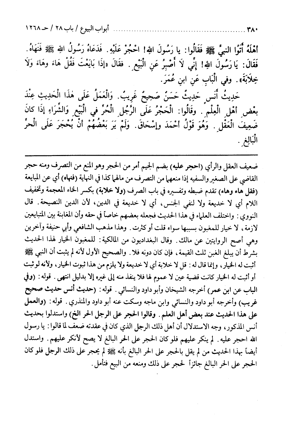 وقَالُوا الْحَجْرُ عَلَى الرَّجُلِ الْحُرِّ إِلَخْ) وَاسْتَدَلُّوا بِحَدِيثِ أَنَسٍ الْمَذْكُورِ وَجْهُ الِاسْتِدْلَالِ أَنَّ أَهْلَ ذَلِكَ الرَّجُلِ الَّذِي كَانَ فِي عُقْدَتِهِ ضَعْفٌ لَمَّا قَالُوا يَا رَسُولَ اللَّهِ احْجُرْ عَلَيْهِ