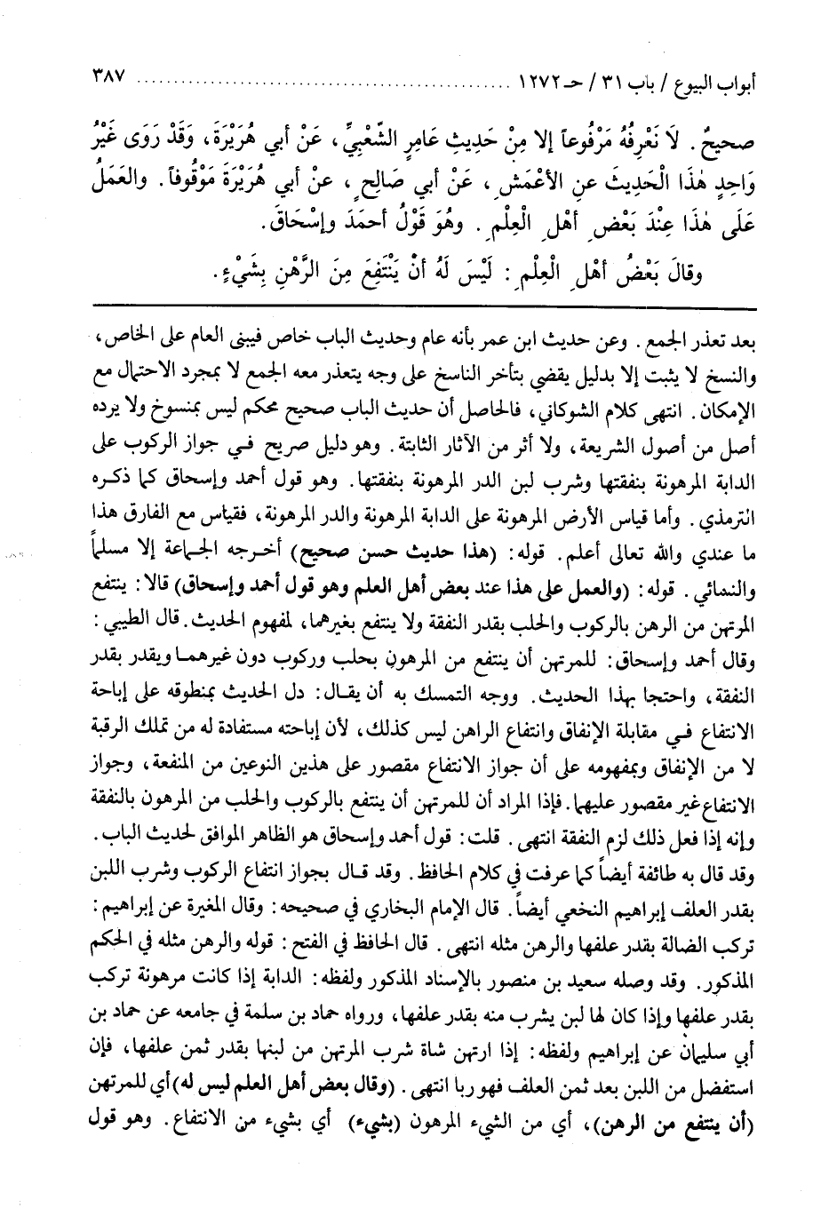 (وَقَالَ بَعْضُ أَهْلِ الْعِلْمِ لَيْسَ لَهُ) أَيْ لِلْمُرْتَهِنِ (أَنْ يَنْتَفِعَ مِنَ الرَّهْنِ) أَيْ مِنَ الشَّيْءِ الْمَرْهُونِ (بِشَيْءٍ) أَيْ بِشَيْءٍ مِنَ الِانْتِفَاعِ