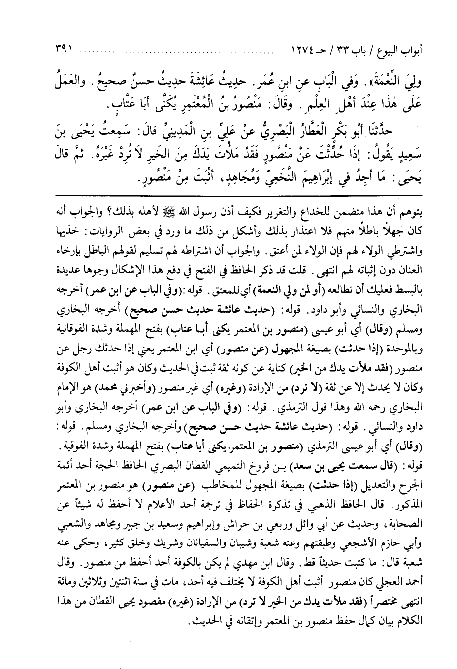 قَوْلُهُ (حَدِيثُ عَائِشَةَ حَدِيثٌ حَسَنٌ صَحِيحٌ) أَخْرَجَهُ الْبُخَارِيُّ وَمُسْلِمٌ (وَقَالَ) أَيْ أَبُو عِيسَى (مَنْصُورُ بْنُ الْمُعْتَمِرِ يُكَنَّى أَبَا عَتَّابٍ) بِفَتْحِ الْمُهْمَلَةِ وَشَدَّةِ الْفَوْقَانِيَّةِ وَبِالْمُوَحَّدَةِ (إِذَا حُدِّثْتَ) بِصِيغَةِ الْمَجْهُولِ (عَنْ منصور) أي بن الْمُعْتَمِرِ يَعْنِي إِذَا حَدَّثَكَ رَجُلٌ عَنْ مَنْصُورٍ (فَقَدْ مَلَأْتَ يَدَكَ مِنَ الْخَيْرِ) كِنَايَةٌ عَنْ كَوْنِهِ ثِقَةً ثَبَتًا فِي الْحَدِيثِ وَكَانَ هُوَ أَثْبَتَ أَهْلِ الْكُوفَةِ وَكَانَ لَا يُحَدِّثُ إِلَّا عن ثقة (لا ترد) من الإرادة (وغيره) أَيْ غَيْرَ مَنْصُورٍ (وَأَخْبَرَنِي مُحَمَّدٌ) هُوَ الْإِمَامُ الْبُخَارِيُّ رَحِمَهُ اللَّهُ وَهَذَا قَوْلُ التِّرْمِذِيِّ