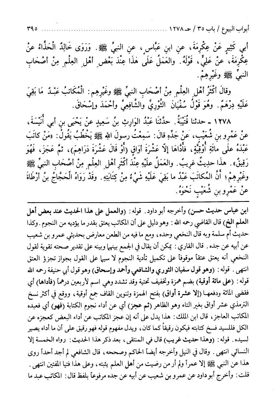 قَوْلُهُ (وَهُوَ قَوْلُ سُفْيَانُ الثَّوْرِيُّ وَالشَّافِعِيُّ وَأَحْمَدُ وَإِسْحَاقُ) وَهُوَ قَوْلُ أَبِي حَنِيفَةَ رَحِمَهُ اللَّهُ [1260] قَوْلُهُ (عَلَى مِائَةِ أُوقِيَّةٍ) بِضَمِّ هَمْزَةٍ وَتَخْفِيفِ تَحْتِيَّةٍ وَقَدْ تُشَدَّدُ وَهِيَ اسْمٌ لِأَرْبَعَيْنِ دِرْهَمًا (فَأَدَّاهَا) أَيْ فَقَضَى الْمِائَةَ وَدَفَعَهَا (إِلَّا عَشْرَةَ أَوَاقٍ) بِفَتْحِ الْهَمْزَةِ وَتَنْوِينِ الْقَافِ جَمْعُ أُوقِيَّةٍ وَوَقَعَ فِي أَكْثَرِ نُسَخِ التِّرْمِذِيِّ عَشْرُ أَوَاقٍ بِغَيْرِ التَّاءِ وَهُوَ الظَّاهِرُ (ثُمَّ عَجَزَ) أَيْ عَنْ أَدَاءِ نُجُومِ الْكِتَابَةِ (فَهُوَ) أي فعبده المكاتب العاجز قال بن الْمَلِكِ هَذَا يَدُلُّ عَلَى أَنَّهُ إِنْ عَجَزَ الْمُكَاتَبُ عَنْ أَدَاءِ الْبَعْضِ كَعَجْزِهِ عَنِ الْكُلِّ فَلِلسَّيِّدِ فَسْخُ كِتَابَتِهِ فَيَكُونُ رَقِيقًا كَمَا كَانَ وَيَدُلُّ مَفْهُومُ قَوْلِهِ فَهُوَ رَقِيقٌ عَلَى أَنَّ مَا أَدَّاهُ يَصِيرُ لِسَيِّدِهِ قَوْلُهُ (وَهَذَا حَدِيثٌ غَرِيبٌ) قَالَ فِي الْمُنْتَقَى بَعْدَ ذِكْرِ هَذَا الْحَدِيثِ رَوَاهُ الْخَمْسَةُ إِلَّا النَّسَائِيَّ انْتَهَى