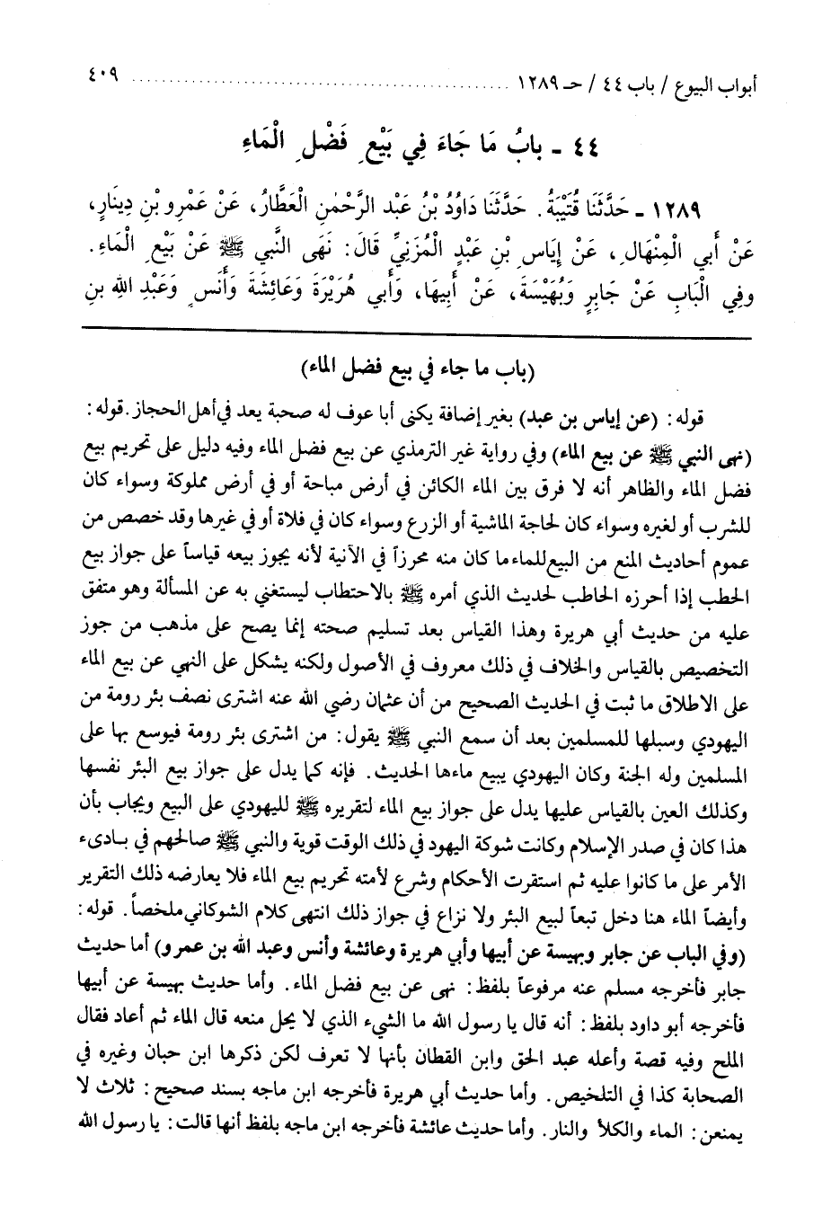 [1271] قَوْلُهُ (عَنْ إِيَاسِ بْنِ عَبْدٍ) بِغَيْرِ إِضَافَةٍ يُكَنَّى أَبَا عَوْفٍ لَهُ صُحْبَةٌ يُعَدُّ فِي أهل الحجاز قَوْلُهُ (نَهَى النَّبِيُّ صَلَّى اللَّهُ عَلَيْهِ وَسَلَّمَ عَنْ بَيْعِ الْمَاءِ) وفِي رِوَايَةِ غَيْرِ التِّرْمِذِيِّ عَنْ بَيْعِ فَضْلِ الْمَاءِ وفِيهِ دَلِيلٌ عَلَى تَحْرِيمِ بَيْعِ فَضْلِ الْمَاءِ وَالظَّاهِرُ أَنَّهُ لَا فَرْقَ بَيْنَ الْمَاءِ الْكَائِنِ فِي أَرْضٍ مُبَاحَةٍ أَوْ فِي أَرْضٍ مَمْلُوكَةٍ وَسَوَاءٌ كَانَ لِلشُّرْبِ أَوْ لِغَيْرِهِ وَسَوَاءٌ كَانَ لِحَاجَةِ الْمَاشِيَةِ أَوْ الزَّرْعِ وَسَوَاءٌ كَانَ فِي فَلَاةٍ أَوْ فِي غَيْرِهَا وَقَدْ خُصِّصَ مِنْ عُمُومِ أَحَادِيثِ الْمَنْعِ مِنَ الْبَيْعِ لِلْمَاءِ مَا كَانَ مِنْهُ مُحْرَزًا فِي الْآنِيَةِ لِأَنَّهُ يَجُوزُ بَيْعُهُ قِيَاسًا