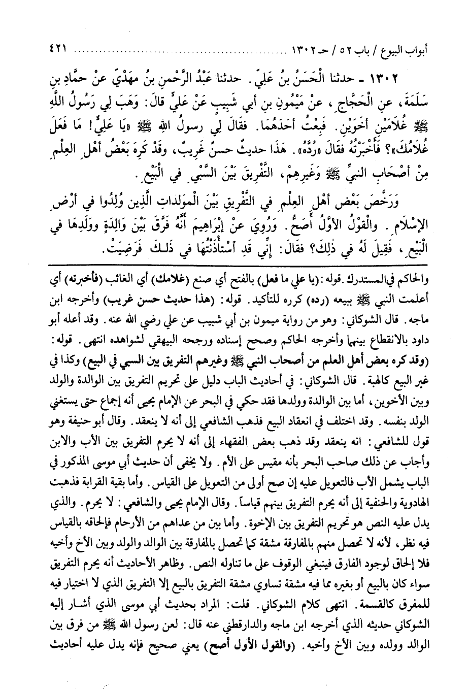 قَالَ الشَّوْكَانِيُّ فِي أَحَادِيثِ الْبَابِ دَلِيلٌ عَلَى تَحْرِيمِ التَّفْرِيقِ بَيْنَ الْوَالِدَةِ وَالْوَلَدِ وَبَيْنَ الْأَخَوَيْنِ أَمَّا بَيْنَ الْوَالِدَةِ وَوَلَدِهَا فَقَدْ حَكَى فِي الْبَحْرِ عَنِ الْإِمَامِ يَحْيَى أَنَّهُ إِجْمَاعٌ حَتَّى يَسْتَغْنِيَ الْوَلَدُ بِنَفْسِهِ