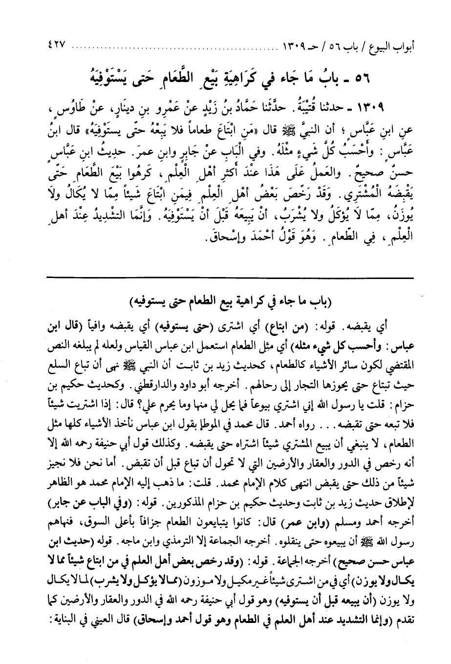 [1291] قَوْلُهُ (مَنِ ابْتَاعَ) أَيْ اشْتَرَى (حَتَّى يَسْتَوفِيَهُ) أَيْ يَقْبِضَهُ وَافِيًا (قال بن عَبَّاسٍ وَأَحْسَبُ كُلَّ شَيْءٍ مِثْلَهُ) أَيْ مِثْلَ الطعام إستعمل بن عَبَّاسٍ الْقِيَاسَ وَلَعَلَّهُ لَمْ يَبْلُغْهُ النَّصُّ الْمُقْتَضِي لِكَوْنِ سَائِرِ الْأَشْيَاءِ كَالطَّعَامِ