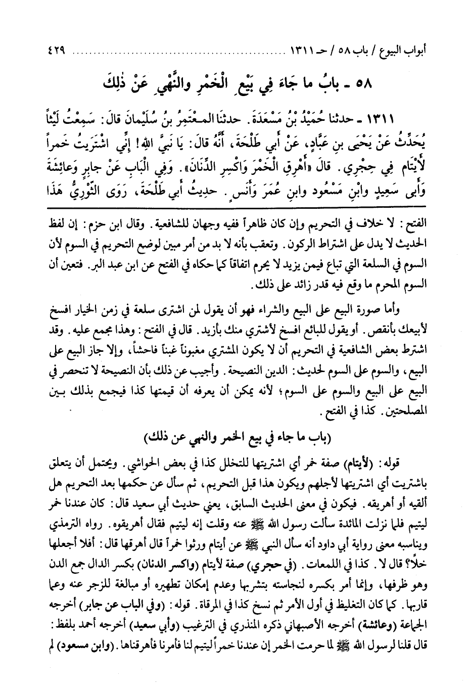 رَوَاهُ التِّرْمِذِيُّ وَيُنَاسِبُهُ مَعْنَى رِوَايَةِ أَبِي دَاوُدَ أَنَّهُ سَأَلَ النَّبِيَّ صَلَّى اللَّهُ عَلَيْهِ وَسَلَّمَ عَنْ أَيْتَامٍ وَرِثُوا خَمْرًا قَالَ أَهْرِقْهَا قَالَ أَفَلَا أَجْعَلُهَا خَلًّا قَالَ لَا