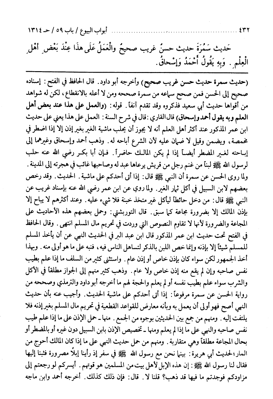 قَوْلُهُ (وَالْعَمَلُ عَلَى هَذَا عِنْدَ بَعْضِ أَهْلِ الْعِلْمِ وَبِهِ يَقُولُ أحمد وإسحاق) قال القارىء قَالَ فِي شَرْحِ السُّنَّةِ الْعَمَلُ عَلَى هَذَا يعني على حديث بن عُمَرَ الْمَذْكُورِ عِنْدَ أَكْثَرِ أَهْلِ الْعِلْمِ أَنَّهُ لَا يَجُوزُ أَنْ يَحْلِبَ مَاشِيَةَ الْغَيْرِ بِغَيْرِ إِذْنٍ إِلَّا إِذَا اضْطُرَّ فِي مَخْمَصَةٍ وَيَضْمَنُ وَقِيلَ لَا ضَمَانَ عَلَيْهِ لِأَنَّ الشَّرْعَ أَبَاحَهُ لَهُ