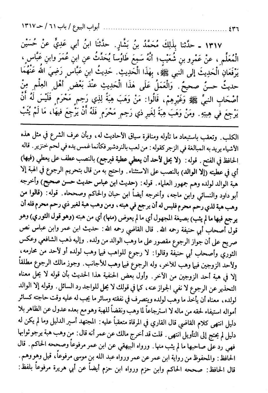 واحْتَجَّ بِهِ مَنْ قَالَ بِتَحْرِيمِ الرُّجُوعِ فِي الْهِبَةِ إِلَّا هِبَةَ الْوَالِدِ لولده وهم جمهور العلماء