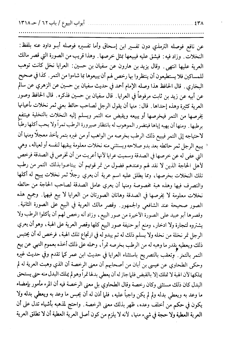 وقَصَرَهَا أَبُو عُبَيْدٍ عَلَى الصُّورَةِ الْأَخِيرَةِ مِنْ صُوَرِ الْبَيْعِ وَزَادَ أَنَّهُ رَخَّصَ لَهُمْ أَنْ يَأْكُلُوا الرُّطَبَ وَلَا يَشْتَرُوهُ لِتِجَارَةٍ وَلَا ادِّخَارٍ وَمَنَعَ أَبُو حَنِيفَةَ صُوَرَ الْبَيْعِ كُلَّهَا وَقَصَرَ الْعَرِيَّةَ عَلَى الْهِبَةِ وَهُوَ أَنْ يُعْرِيَ الرَّجُلُ تَمْرَ نَخْلَةٍ مِنْ نَخْلِهِ وَلَا يُسَلِّمَ ذَلِكَ لَهُ ثُمَّ يَبْدُو لَهُ فِي ارْتِجَاعِ تِلْكَ الْهِبَةِ فَرُخِّصَ لَهُ أَنْ يَحْتَبِسَ ذَلِكَ وَيُعْطِيَهُ بِقَدْرِ مَا وَهَبَهُ لَهُ مِنَ الرُّطَبِ بِخَرْصِهِ تَمْرًا وَحَمَلَهُ عَلَى ذَلِكَ أَخْذُهُ بِعُمُومِ النَّهْيِ عَنْ بَيْعِ التَّمْرِ بِالتَّمْرِ