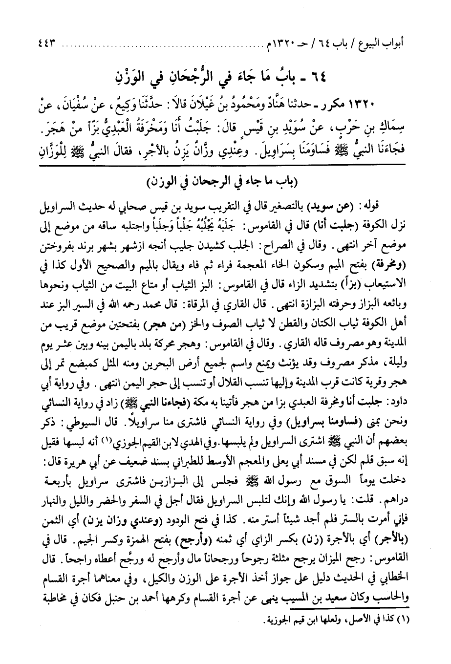 [1305] قَوْلُهُ (عَنْ سُوَيْدٍ) بِالتَّصْغِيرِ قَالَ فِي التَّقْرِيبِ سُوَيْدُ بْنُ قَيْسٍ صَحَابِيٌّ لَهُ حَدِيثُ السَّرَاوِيلِ نَزَلَ الْكُوفَةَ (جَلَبْتُ أَنَا) قَالَ فِي الْقَامُوسِ جَلَبَهُ يَجْلِبُهُ جَلْبًا وَجَلَبًا وَاجْتَلَبَهُ سَاقَهُ مِنْ مَوْضِعٍ إِلَى مَوْضِعٍ آخَرَ انْتَهَى