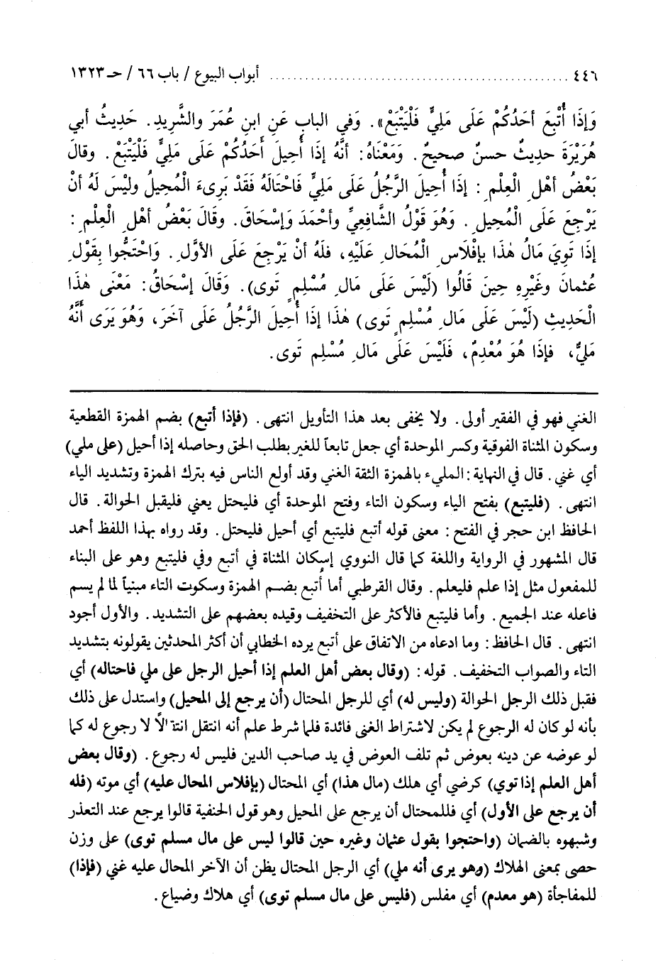[1309] (فَإِذَا أُتْبِعَ) بِضَمِّ الْهَمْزَةِ الْقَطْعِيَّةِ وَسُكُونِ الْمُثَنَّاةِ الْفَوْقِيَّةِ وَكَسْرِ الْمُوَحَّدَةِ أَيْ جُعِلَ تَابِعًا لِلْغَيْرِ بِطَلَبِ الْحَقِّ وَحَاصِلُهُ إِذَا أُحِيلَ (عَلَى مَلِيٍّ) أَيْ غَنِيٍّ