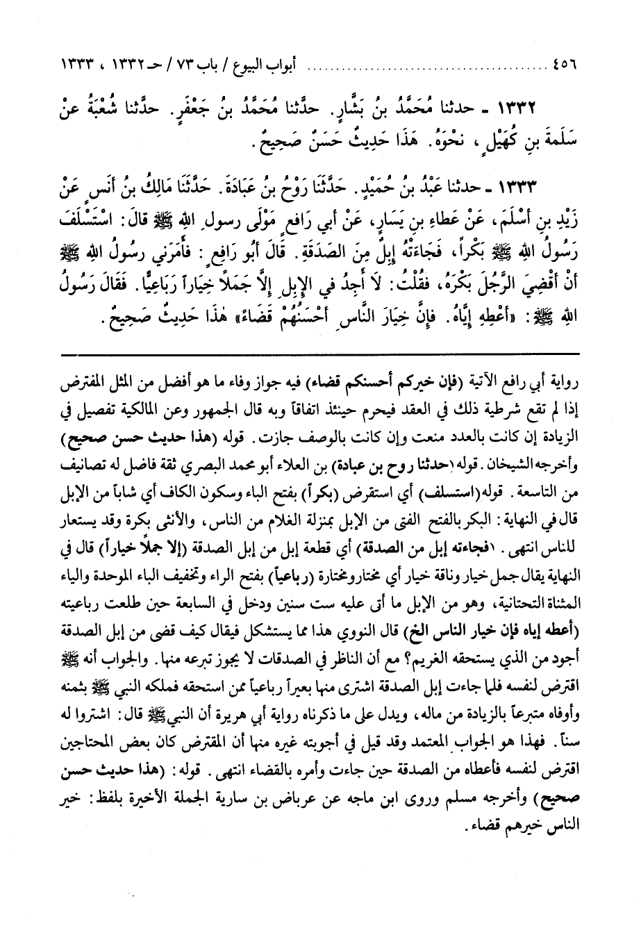 [1318] قَوْلُهُ (اسْتَسْلَفَ) أَيْ اسْتَقْرَضَ (بَكْرًا) بِفَتْحِ الْبَاءِ وَسُكُونِ الْكَافِ أَيْ شَابًّا مِنَ الْإِبِلِ قَالَ فِي النِّهَايَةِ الْبَكْرُ بِالْفَتْحِ الْفَتِيُّ مِنَ الْإِبِلِ بِمَنْزِلَةِ الْغُلَامِ مِنَ النَّاسِ وَالْأُنْثَى بَكْرَةٌ وَقَدْ يُسْتَعَارُ لِلنَّاسِ انْتَهَى