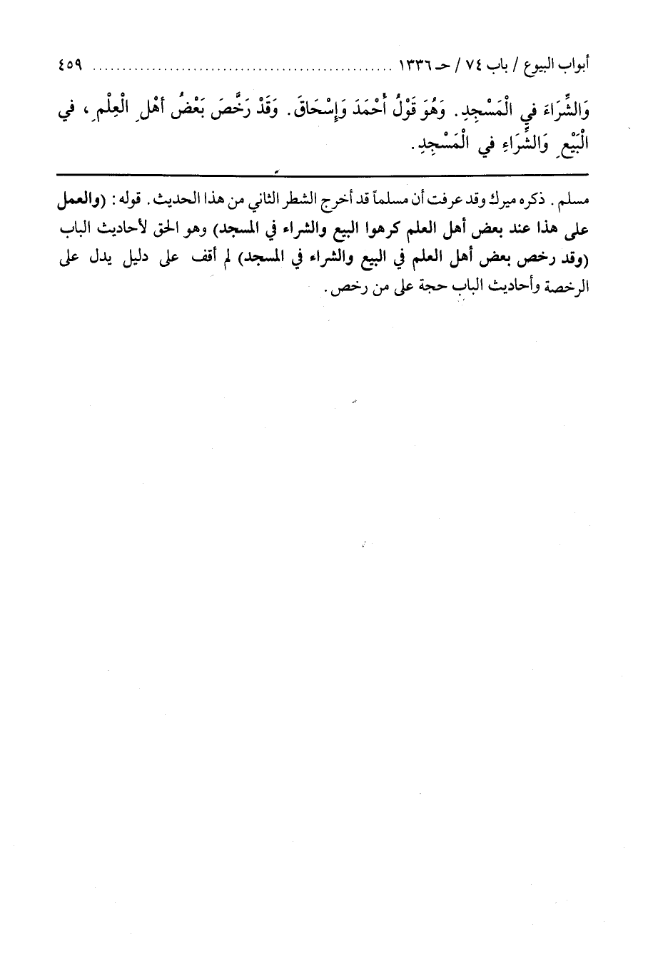 قَوْلُهُ (وَالْعَمَلُ عَلَى هَذَا عِنْدَ بَعْضِ أَهْلِ الْعِلْمِ كَرِهُوا الْبَيْعَ وَالشِّرَاءَ فِي الْمَسْجِدِ) وَهُوَ الْحَقُّ لِأَحَادِيثِ الْبَابِ (وَقَدْ رَخَّصَ بَعْضُ أَهْلِ الْعِلْمِ فِي الْبَيْعِ وَالشِّرَاءِ فِي الْمَسْجِدِ) لَمْ أَقِفْ عَلَى دَلِيلٍ يَدُلُّ عَلَى الرُّخْصَةِ وَأَحَادِيثُ الْبَابِ حُجَّةٌ عَلَى مَنْ رَخَّصَ