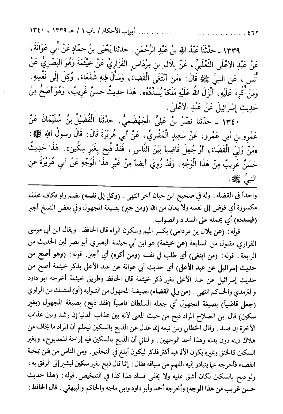 [1325] (مَنْ وُلِّيَ الْقَضَاءَ) بِصِيغَةِ الْمَجْهُولِ مِنَ التَّوْلِيَةِ (أَوْ) لِلشَّكِّ مِنَ الرَّاوِي (جُعِلَ قَاضِيًا) بِصِيغَةِ الْمَجْهُولِ أَيْ جَعَلَهُ السُّلْطَانُ قَاضِيًا (فَقَدْ ذُبِحَ) بصيغة المجهول (بغير سكين) قال بن الصَّلَاحِ الْمُرَادُ ذُبِحَ مِنْ حَيْثُ الْمَعْنَى لِأَنَّهُ بَيْنَ عَذَابِ الدُّنْيَا إِنْ رَشَدَ وَبَيْنَ عَذَابِ الْآخِرَةِ إِنْ فَسَدَ
