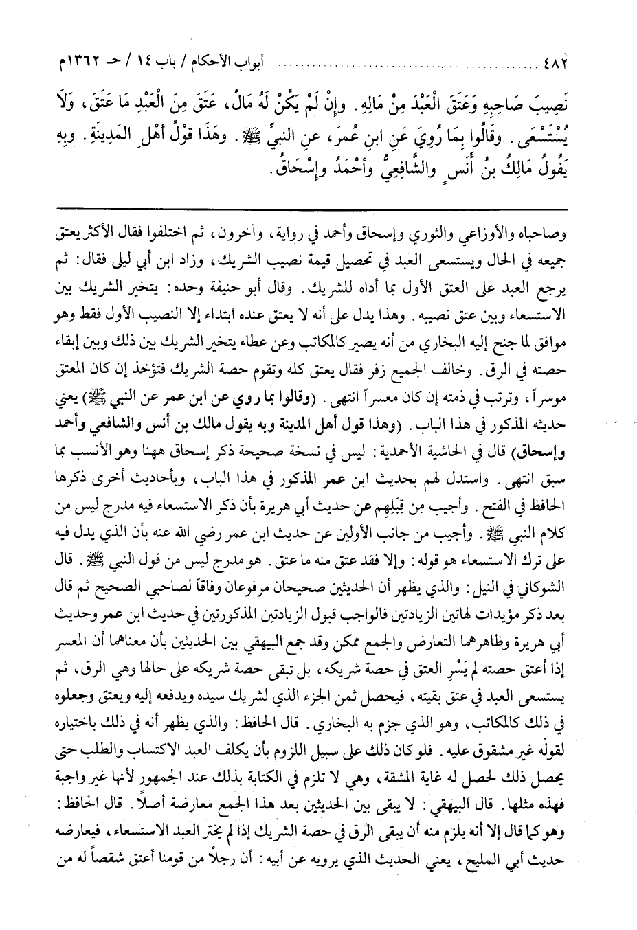 وَصَاحِبَاهُ وَالْأَوْزَاعِيُّ وَالثَّوْرِيُّ وَإِسْحَاقُ وَأَحْمَدُ فِي رِوَايَةٍ وَآخَرُونَ ثُمَّ اخْتَلَفُوا فَقَالَ الْأَكْثَرُ يَعْتِقُ جَمِيعُهُ فِي الْحَالِ وَيُسْتَسْعَى الْعَبْدُ فِي تَحْصِيلِ قِيمَةِ نصيب الشريك وزاد بن أَبِي لَيْلَى فَقَالَ ثُمَّ يَرْجِعُ الْعَبْدُ عَلَى الْمُعْتِقِ الْأَوَّلِ بِمَا أَدَّاهُ لِلشَّرِيكِ وَقَالَ أَبُو حَنِيفَةَ وَحْدَهُ يَتَخَيَّرُ الشَّرِيكُ بَيْنَ الِاسْتِسْعَاءِ وَبَيْنَ عِتْقِ نَصِيبِهِ
