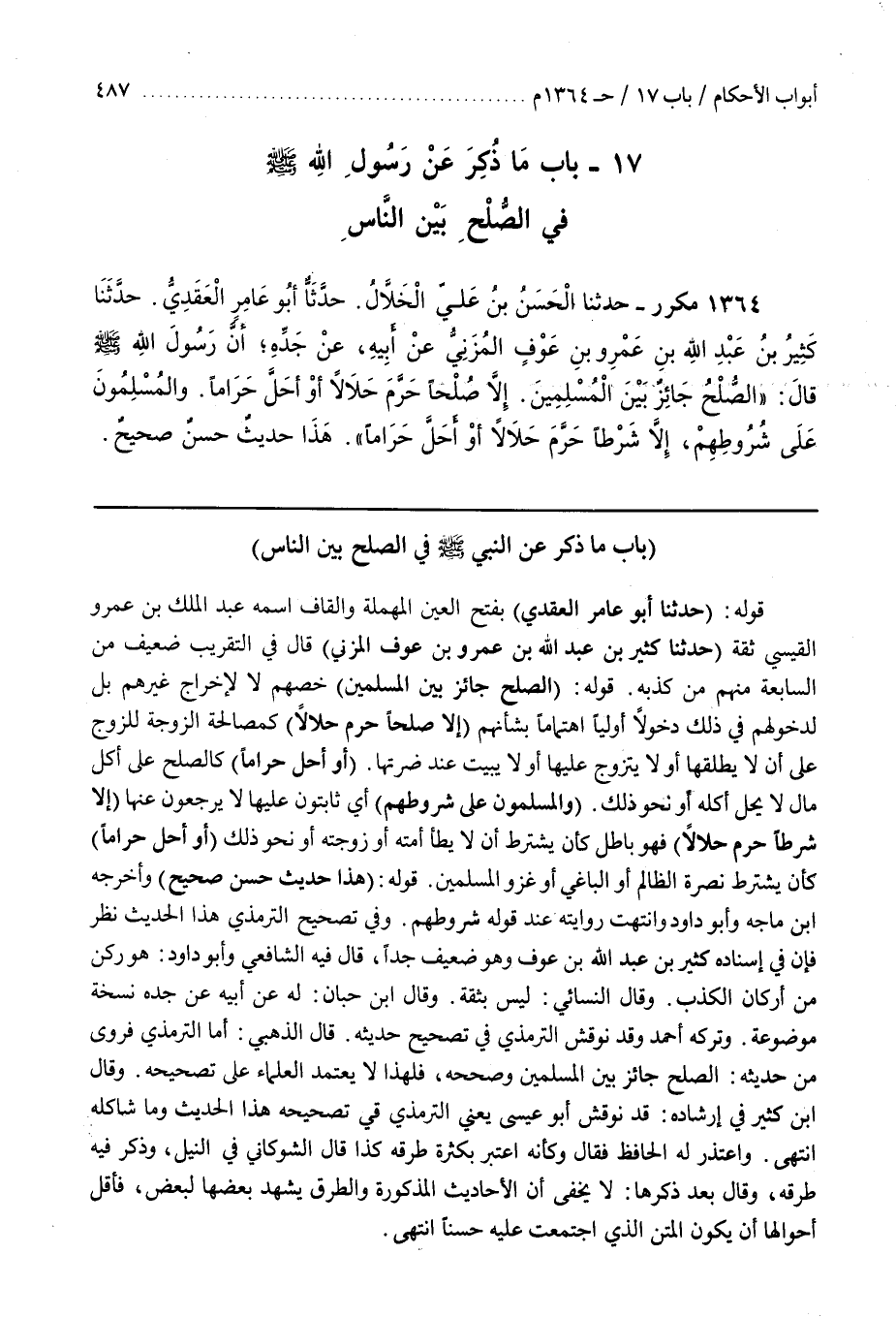 قَالَ الذَّهَبِيُّ أَمَّا التِّرْمِذِيِّ فَرَوَى مِنْ حَدِيثِهِ الصُّلْحُ جَائِزٌ بَيْنَ الْمُسْلِمِينَ وَصَحَّحَهُ فَلِهَذَا لَا يَعْتَمِدُ الْعُلَمَاءُ عَلَى تَصْحِيحِهِ