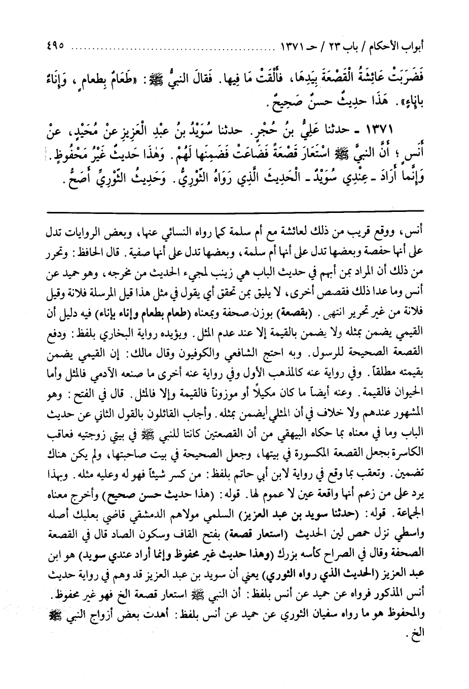وأَجَابَ الْقَائِلُونَ بِالْقَوْلِ الثَّانِي عَنْ حَدِيثِ الْبَابِ وَمَا فِي مَعْنَاهُ بِمَا حَكَاهُ الْبَيْهَقِيُّ مِنْ أَنَّ الْقَصْعَتَيْنِ كَانَتَا لِلنَّبِيِّ صَلَّى اللَّهُ عَلَيْهِ وَسَلَّمَ فِي بَيْتَيْ زَوْجَتَيْهِ فَعَاقَبَ الْكَاسِرَةَ بِجَعْلِ الْقَصْعَةِ الْمَكْسُورَةِ فِي بَيْتِهَا وَجَعَلَ الصَّحِيحَةَ فِي بَيْتِ صَاحِبَتِهَا وَلَمْ يَكُنْ هُنَاكَ تَضْمِينٌ
