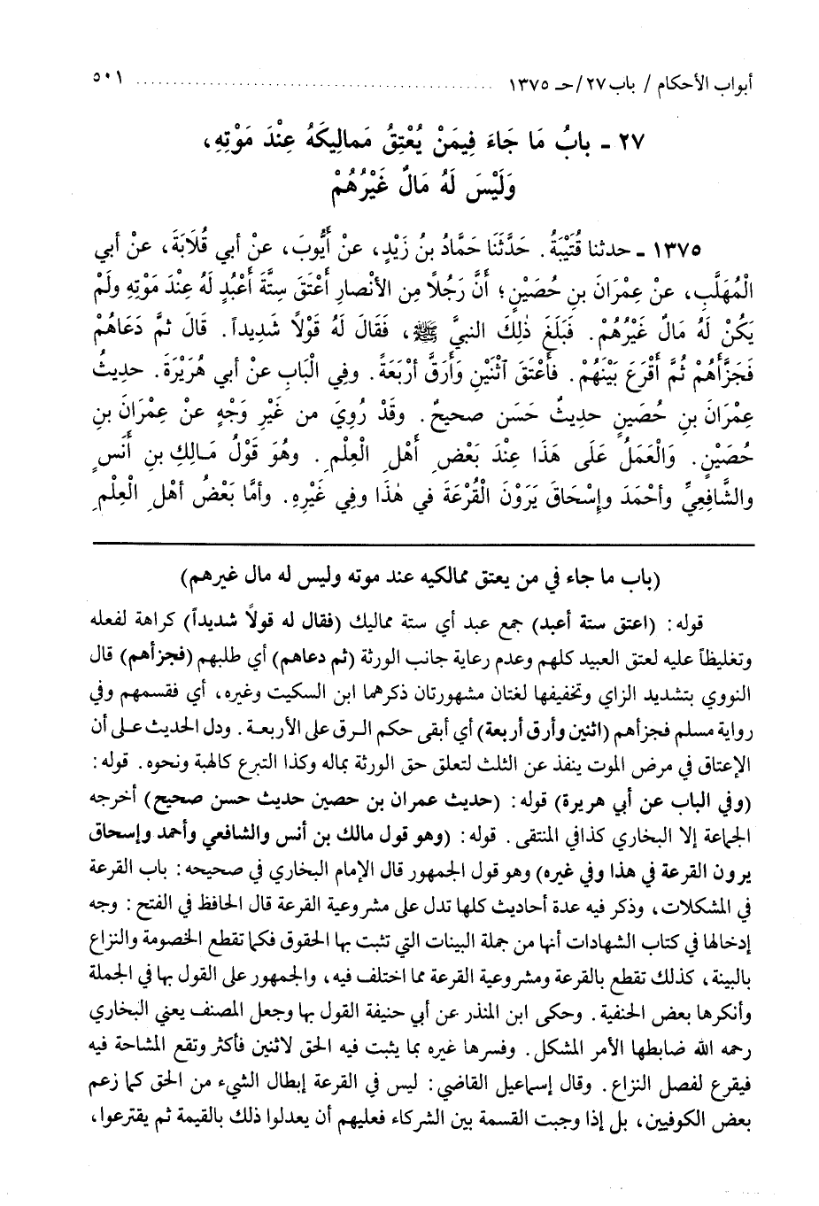 وَلَيْسَ لَهُ مَالٌ غَيْرُهُمْ [1364] قَوْلُهُ (أَعْتَقَ سِتَّةَ أَعْبُدٍ) جَمْعُ عَبْدٍ أَيْ سِتَّةَ مَمَالِيكَ (فَقَالَ لَهُ قَوْلًا شَدِيدًا) كَرَاهَةً لِفِعْلِهِ وَتَغْلِيظًا عَلَيْهِ لِعِتْقِ الْعَبِيدِ كُلِّهِمْ وَعَدَمِ رِعَايَةِ جَانِبِ الْوَرَثَةِ (ثُمَّ دَعَاهُمْ) أَيْ طَلَبَهُمْ (فَجَزَّأَهُمْ) قَالَ النَّوَوِيُّ بِتَشْدِيدِ الزَّايِ وَتَخْفِيفِهَا لُغَتَانِ مَشْهُورَتَانِ ذَكَرَهُمَا بن السِّكِّيتِ وَغَيْرُهُ أَيْ فَقَسَّمَهُمْ وفِي رِوَايَةِ مُسْلِمٍ فَجَزَّأَهُمْ (ثَلَاثًا وَأَرَقَّ أَرْبَعَةً) أَيْ أَبْقَى حُكْمَ الرِّقِّ عَلَى الْأَرْبَعَةِ