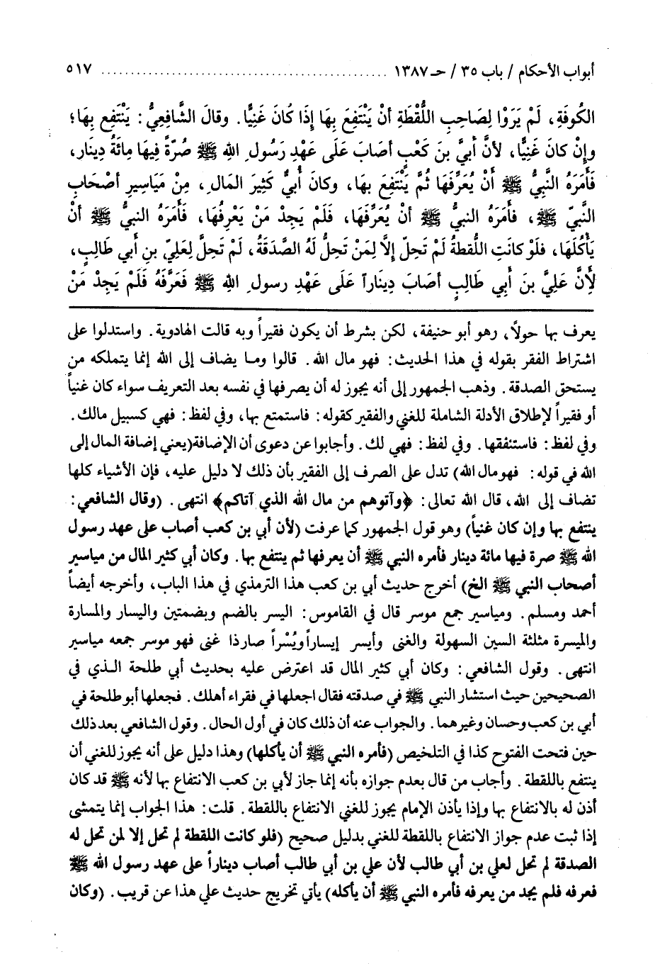 قُلْتُ هَذَا الْجَوَابُ إِنَّمَا يَتَمَشَّى إِذَا ثَبَتَ عَدَمُ جَوَازِ الِانْتِفَاعِ بِاللُّقَطَةِ لِلْغَنِيِّ بِدَلِيلٍ صَحِيحٍ (فَلَوْ كَانَتِ اللُّقَطَةُ لَمْ تَحِلَّ إِلَّا لِمَنْ تَحِلُّ لَهُ الصَّدَقَةُ لَمْ تَحِلَّ لِعَلِيِّ بْنِ أَبِي طَالِبٍ لِأَنَّ عَلِيَّ بْنَ أَبِي طَالِبٍ أَصَابَ دِينَارًا عَلَى عَهْدِ رَسُولِ اللَّهِ صَلَّى اللَّهُ عَلَيْهِ وَسَلَّمَ فَعَرَّفَهُ فَلَمْ يَجِدْ مَنْ يَعْرِفُهُ فَأَمَرَهُ النَّبِيُّ صَلَّى اللَّهُ عَلَيْهِ وَسَلَّمَ أَنْ يَأْكُلَهُ) يَأْتِي تَخْرِيجُ حَدِيثِ عَلِيٍّ هَذَا عَنْ قَرِيبٍ