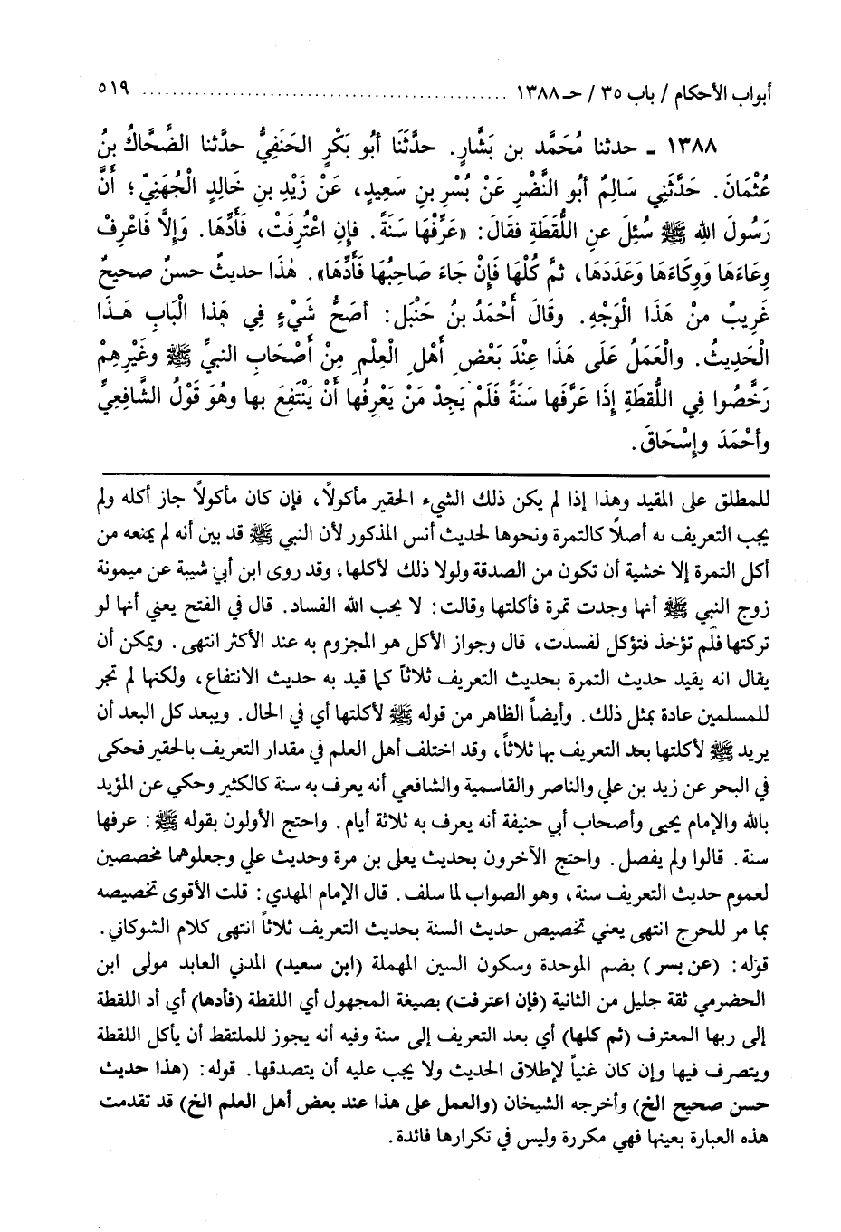 [1373] قَوْلُهُ (عَنْ بُسْرٍ) بِضَمِّ الْمُوَحَّدَةِ وَسُكُونِ السِّينِ المهملة (بن سعيد) المدني العابد مولى بن الْحَضْرَمِيِّ ثِقَةٌ جَلِيلٌ مِنَ الثَّانِيَةِ (فَإِنِ اعْتُرِفَتْ) بِصِيغَةِ الْمَجْهُولِ أَيْ اللُّقَطَةِ (فَأَدِّهَا) أَيْ أَدِّ إِلَى رَبِّهَا الْمُعْتَرِفِ (ثُمَّ كُلْهَا) أَيْ بَعْدَ التَّعْرِيفِ إِلَى سَنَةٍ وفِيهِ أَنَّهُ يَجُوزُ لِلْمُلْتَقِطِ أَنْ يَأْكُلَ اللُّقَطَةَ وَيَتَصَرَّفَ فِيهَا وَإِنْ كَانَ غنيا لإطلاقا الْحَدِيثِ وَلَا يَجِبُ عَلَيْهِ أَنْ يَتَصَدَّقَهَا