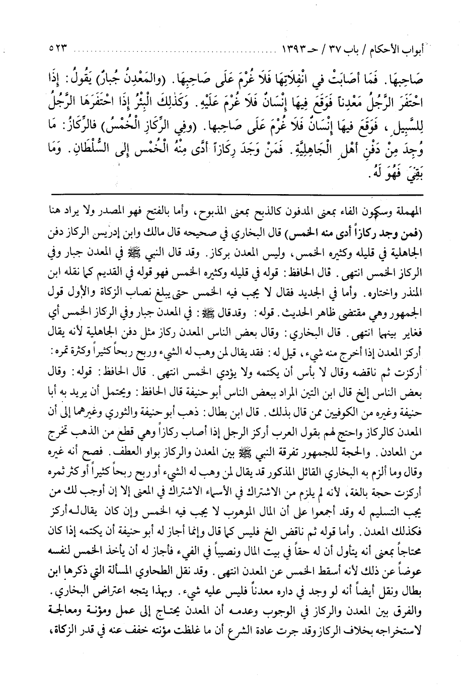 وأَمَّا بِالْفَتْحِ فَهُوَ الْمَصْدَرُ وَلَا يُرَادُ هُنَا (فَمَنْ وَجَدَ رِكَازًا أَدَّى مِنْهُ الْخُمْسَ) قال البخاري في صحيحه قال مالك وبن إِدْرِيسَ الرِّكَازُ دَفْنُ الْجَاهِلِيَّةِ فِي قَلِيلِهِ وَكَثِيرِهِ الْخُمْسُ وَلَيْسَ الْمَعْدِنُ بِرِكَازٍ