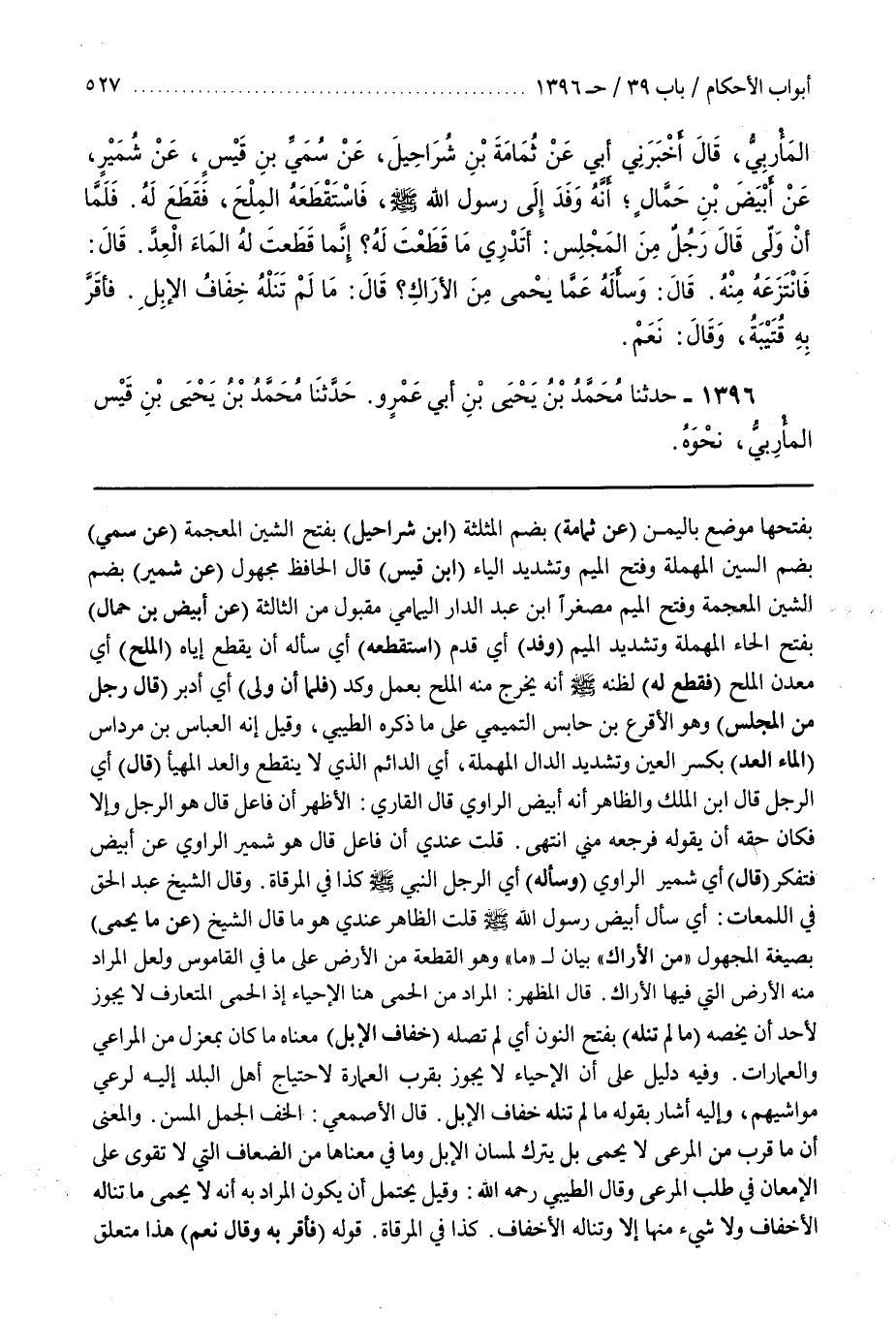بفتحها موضع باليمين (عَنْ ثُمَامَةَ) بِضَمِّ الْمُثَلَّثَةِ (بْنِ شَرَاحِيلَ) بِفَتْحِ الشِّينِ الْمُعْجَمَةِ (عَنْ سُمَيٍّ) بِضَمِّ السِّينِ الْمُهْمَلَةِ وفتح الميم وتشديد الياء (بن قَيْسٍ) قَالَ الْحَافِظُ مَجْهُولٌ (عَنْ شُمَيْرٍ) بِضَمِّ الشين المعجمة وفتح الميم مصغرا بن عَبْدِ الدَّارِ الْيَمَامِيُّ مَقْبُولٌ مِنَ الثَّالِثَةِ (عَنْ أَبْيَضَ بْنِ حَمَّالٍ) بِفَتْحِ الْحَاءِ الْمُهْمَلَةِ وَتَشْدِيدِ الْمِيمِ (وَفَدَ) أَيْ قَدِمَ (اسْتَقْطَعَهُ) أَيْ سَأَلَهُ أَنْ يُقَطِّعَ إِيَّاهُ (الْمِلْحَ) أَيْ مَعْدِنَ الْمِلْحِ (فَقَطَّعَ لَهُ) لِظَنِّهِ صَلَّى اللَّهُ عَلَيْهِ وَسَلَّمَ أَنَّهُ يُخْرِجَ مِنْهُ الْمِلْحَ بِعَمَلٍ وَكَدٍّ (فَلَمَّا أَنْ وَلَّى) أَيْ أَدْبَرَ (قَالَ رَجُلٌ مِنَ المجلس) وهو الْأَقْرَعُ بْنُ حَابِسٍ التَّمِيمِيُّ عَلَى مَا ذَكَرَهُ الطِّيبِيُّ وَقِيلَ إِنَّهُ الْعَبَّاسُ بْنُ مِرْدَاسٍ (الْمَاءَ الْعِدَّ) بِكَسْرِ الْعَيْنِ وَتَشْدِيدِ الدَّالِ الْمُهْمَلَةِ أَيْ الدَّائِمُ الَّذِي لَا يَنْقَطِعُ وَالْعِدُّ الْمُهَيَّأُ (قَالَ) أي الرجل قال بن الملك والظاهر أنه أبيض الراوي قال القارىء الْأَظْهَرُ أَنَّ فَاعِلَ قَالَ هُوَ الرَّجُلُ وَإِلَّا فَكَانَ حَقُّهُ أَنْ يَقُولَهُ فَرَجَعَهُ مِنِّي انْتَهَى
