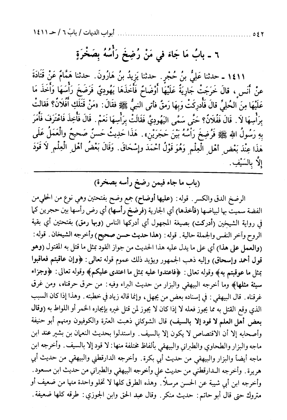 [1394] قَوْلُهُ (عَلَيْهَا أَوْضَاحٌ) جَمْعُ وَضَحٍ بِفَتْحَتَيْنِ وَهِيَ نَوْعٌ مِنَ الْحُلِيِّ مِنَ الْفِضَّةِ سُمِّيَتْ بِهَا لِبَيَاضِهَا (فَأَخَذَهَا) أَيْ الْجَارِيَةَ (فَرَضَخَ رَأْسهَا) أَيْ رَضَّ رَأْسَهَا بَيْنَ حَجَرَيْنِ كَمَا فِي رِوَايَةِ الشَّيْخَيْنِ (أُدْرِكَتْ) بِصِيغَةِ الْمَجْهُولِ أَيْ أَدْرَكَهَا النَّاسُ (وَبِهَا رَمَقٌ) بِفَتْحَتَيْنِ أَيْ بَقِيَّةُ الرُّوحِ وَآخِرُ النَّفَسِ وَالْجُمْلَةُ حَالِيَّةٌ قَوْلُهُ (حَدِيثٌ حَسَنٌ صَحِيحٌ) وَأَخْرَجَهُ الشَّيْخَانِ قَوْلُهُ (وَالْعَمَلُ عَلَى هَذَا) أَيْ عَلَى مَا يَدُلُّ عَلَيْهِ هَذَا الْحَدِيثُ مِنْ جَوَازِ الْقَوَدِ بِمِثْلِ مَا قُتِلَ بِهِ الْمَقْتُولُ (وَهُوَ قَوْلُ أَحْمَدَ وَإِسْحَاقَ) وَإِلَيْهِ ذَهَبَ الْجُمْهُورُ وَيُؤَيِّدُ ذَلِكَ عُمُومُ قَوْلِهِ تَعَالَى وَإِنْ عَاقَبْتُمْ فَعَاقِبُوا بِمِثْلِ مَا عُوقِبْتُمْ به وَقَوْلُهُ تَعَالَى فَاعْتَدُوا عَلَيْهِ بِمِثْلِ مَا اعْتَدَى عليكم وقوله تعالى وجزاء سيئة سيئة مثلها وَمَا أَخْرَجَهُ الْبَيْهَقِيُّ وَالْبَزَّارُ مِنْ حَدِيثِ الْبَرَاءِ وفِيهِ مَنْ حَرَّقَ حَرَّقْنَاهُ وَمَنْ غَرَّقَ غَرَّقْنَاهُ