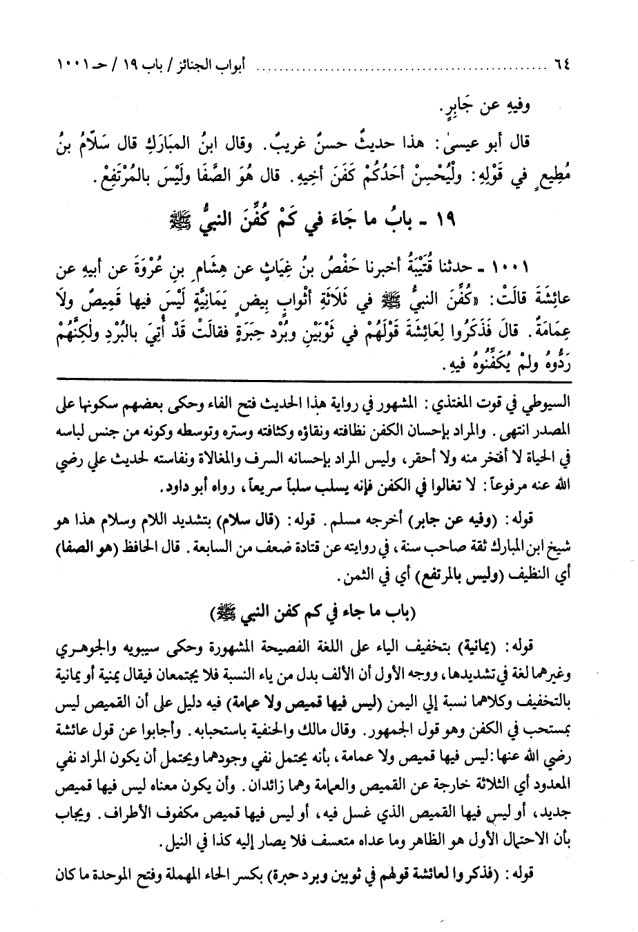 9 - ما جاء في كم كَفَنِ النَّبِيِّ صَلَّى اللَّهُ عَلَيْهِ وَسَلَّمَ [996] قَوْلُهُ (يَمَانِيَّةٌ) بِتَخْفِيفِ الْيَاءِ عَلَى اللُّغَةِ الْفَصِيحَةِ الْمَشْهُورَةِ وَحَكَى سِيبَوَيْهِ وَالْجَوْهَرِيُّ وَغَيْرُهُمَا لُغَةً فِي تَشْدِيدِهَا وَجْهُ الْأَوَّلِ أَنَّ الْأَلِفَ بَدَلٌ مِنْ يَاءِ النِّسْبَةِ فَلَا يَجْتَمِعَانِ فَيُقَالُ يَمَنِيَّةٌ أَوْ يَمَانِيَةٌ بِالتَّخْفِيفِ وَكِلَاهُمَا نِسْبَةٌ إِلَى الْيَمَنِ (لَيْسَ فِيهَا قَمِيصٌ وَلَا عِمَامَةٌ) فِيهِ دَلِيلٌ عَلَى أَنَّ الْقَمِيصَ لَيْسَ بِمُسْتَحَبٍّ فِي الْكَفَنِ وَهُوَ قَوْلُ الْجُمْهُورِ