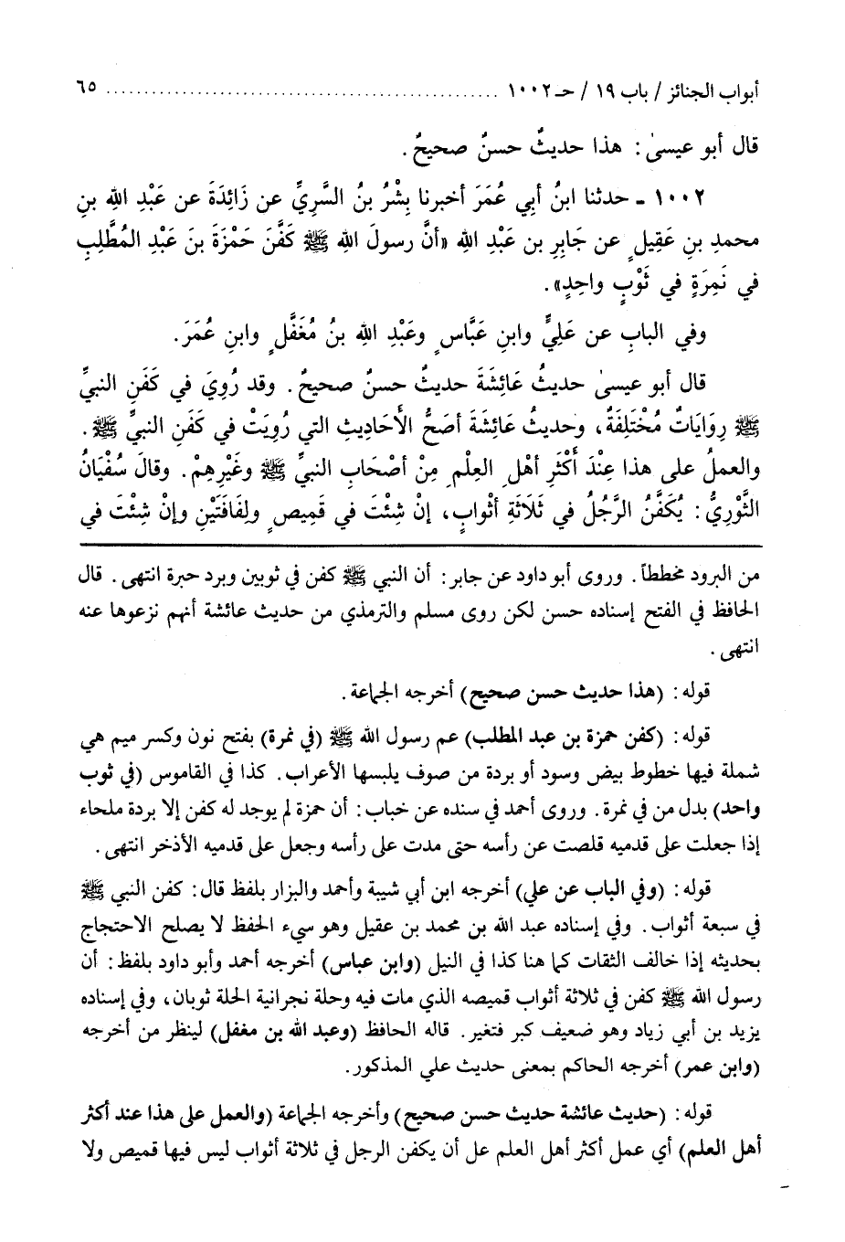 قَوْلُهُ (حَدِيثُ عَائِشَةَ حَدِيثٌ حَسَنٌ صَحِيحٌ) وَأَخْرَجَهُ الْجَمَاعَةُ (وَالْعَمَلُ عَلَى هَذَا عِنْدَ أَكْثَرِ أَهْلِ الْعِلْمِ) أَيْ عَمَلُ أَكْثَرِ أَهْلِ الْعِلْمِ عَلَى أَنْ يُكَفَّنَ الرَّجُلُ فِي ثَلَاثَةِ أَثْوَابٍ لَيْسَ فِيهَا قَمِيصٌ وَلَا