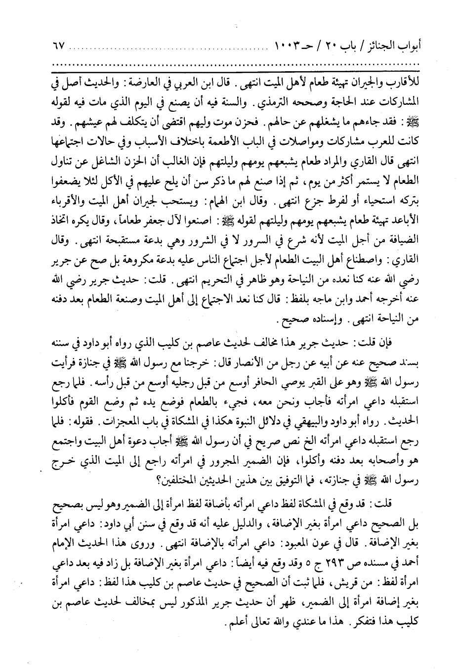 فَقَوْلُهُ فَلَمَّا رَجَعَ اسْتَقْبَلَهُ دَاعِي امْرَأَتِهِ إِلَخْ نَصٌّ صَرِيحٌ فِي أَنَّ رَسُولَ اللَّهِ صَلَّى اللَّهُ عَلَيْهِ وَسَلَّمَ أَجَابَ دَعْوَةَ أَهْلِ الْبَيْتِ وَاجْتَمَعَ هُوَ وَأَصْحَابُهُ بَعْدَ دَفْنِهِ وَأَكَلُوا فَإِنَّ الضَّمِيرَ الْمَجْرُورَ فِي امْرَأَتِهِ رَاجِعٌ إِلَى ذَلِكَ الْمَيِّتِ الَّذِي خَرَجَ رَسُولُ اللَّهِ صَلَّى اللَّهُ عَلَيْهِ وَسَلَّمَ فِي جِنَازَتِهِ فَمَا التَّوفِيقُ بَيْنَ هَذَيْنِ الْحَدِيثَيْنِ الْمُخْتَلِفَيْنِ قُلْتُ قَدْ وَقَعَ فِي الْمِشْكَاةِ لَفْظُ دَاعِي امْرَأَتِهِ بِإِضَافَةِ لَفْظِ امْرَأَةٍ إِلَى الضَّمِيرِ وَهُوَ لَيْسَ بِصَحِيحٍ بَلِ الصَّحِيحُ دَاعِي امْرَأَةٍ بِغَيْرِ الْإِضَافَةِ وَالدَّلِيلُ عَلَيْهِ أَنَّهُ قَدْ وَقَعَ فِي سُنَنِ أَبِي دَاوُدَ دَاعِي امْرَأَةٍ بِغَيْرِ الْإِضَافَةِ