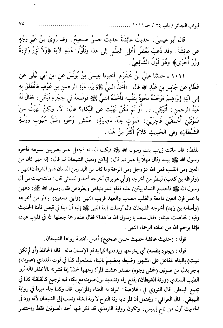 بِلَفْظِ قَالَ مَاتَتْ زَيْنَبُ بِنْتُ رَسُولِ اللَّهِ صَلَّى اللَّهُ عَلَيْهِ وَسَلَّمَ فَبَكَتِ النِّسَاءُ فَجَعَلَ عُمَرُ يَضْرِبُهُنَّ بِسَوْطِهِ فَأَخَّرَهُ رَسُولُ اللَّهِ صَلَّى اللَّهُ عَلَيْهِ وَسَلَّمَ بِيَدِهِ وَقَالَ مَهْلًا يَا عُمَرُ ثُمَّ قَالَ إِيَّاكُنَّ وَنَعِيقَ الشَّيْطَانِ ثُمَّ قَالَ إِنَّهُ مَهْمَا كَانَ مِنَ الْعَيْنِ وَمِنَ الْقَلْبِ فَمِنَ اللَّهِ عَزَّ وَجَلَّ وَمِنَ الرَّحْمَةِ وَمَا كَانَ مِنَ الْيَدِ وَمِنَ اللِّسَانِ فَمِنَ الشَّيْطَانِ انْتَهَى (وَقَرَظَةُ بْنُ كَعْبٍ) لِيُنْظَرْ مَنْ أخرجه قوله (وَأَبِي هُرَيْرَةَ) أَخْرَجَهُ أَحْمَدُ وَالنَّسَائِيُّ قَالَ مَاتَ مَيِّتٌ مِنْ آلِ رَسُولِ اللَّهِ صَلَّى اللَّهُ عَلَيْهِ وَسَلَّمَ فَاجْتَمَعَ النِّسَاءُ يَبْكِينَ عَلَيْهِ فَقَامَ عُمَرُ يَنْهَاهُنَّ وَيَطْرُدُهُنَّ فَقَالَ رَسُولُ اللَّهِ صَلَّى اللَّهُ عَلَيْهِ وَسَلَّمَ دَعْهُنَّ يَا عُمَرُ فَإِنَّ الْعَيْنَ دَامِعَةٌ وَالْقَلْبَ مُصَابٌ وَالْعَهْدَ قَرِيبٌ انْتَهَى (وبن مَسْعُودٍ) لِيُنْظَرْ مَنْ أَخْرَجَهُ (وَأُسَامَةَ بْنِ زَيْدٍ) أَخْرَجَهُ الشَّيْخَانِ قَالَ أَرْسَلَتْ ابْنَةُ النَّبِيِّ صَلَّى اللَّهُ عَلَيْهِ وَسَلَّمَ إِلَيْهِ أَنَّ ابْنًا لِي قُبِضَ فَأْتِنَا الْحَدِيثَ وفِيهِ فَفَاضَتْ عَيْنَاهُ فَقَالَ سَعْدٌ يَا رَسُولَ اللَّهِ مَا هَذَا فَقَالَ هَذِهِ رَحْمَةٌ جَعَلَهَا اللَّهُ فِي قُلُوبِ عِبَادِهِ فَإِنَّمَا يَرْحَمُ اللَّهُ مِنْ عِبَادِهِ الرُّحَمَاءَ انْتَهَى