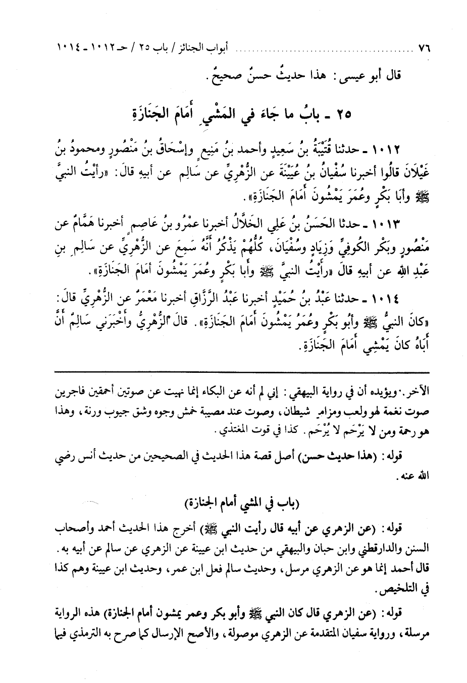 [1009] قَوْلُهُ (عَنِ الزُّهْرِيِّ قَالَ كَانَ النَّبِيُّ صَلَّى اللَّهُ عَلَيْهِ وَسَلَّمَ وَأَبُو بَكْرٍ وَعُمَرُ يَمْشُونَ أَمَامَ الْجِنَازَةِ) هَذِهِ الرِّوَايَةُ مُرْسَلَةٌ وَرِوَايَةُ سُفْيَانَ الْمُتَقَدِّمَةُ عَنِ الزُّهْرِيِّ مَوْصُولَةٌ وَالْأَصَحُّ الْإِرْسَالُ كَمَا صَرَّحَ بِهِ التِّرْمِذِيُّ فِيمَا