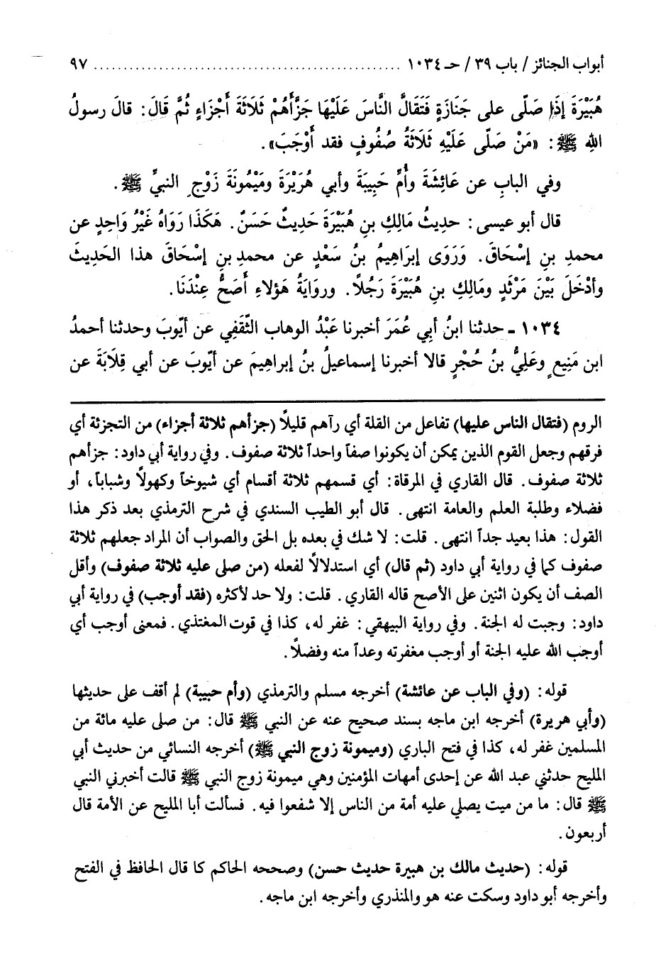 قَوْلُهُ (وفِي الْبَابِ عَنْ عَائِشَةَ) أَخْرَجَهُ مُسْلِمٌ وَالتِّرْمِذِيُّ (وَأُمِّ حَبِيبَةَ) لَمْ أَقِفْ عَلَى حَدِيثِهَا (وأبي هريرة) أخرجه بن مَاجَهْ بِسَنَدٍ صَحِيحٍ عَنْهُ عَنِ النَّبِيِّ صَلَّى اللَّهُ عَلَيْهِ وَسَلَّمَ قَالَ مَنْ صَلَّى عَلَيْهِ مِائَةٌ مِنَ الْمُسْلِمِينَ غُفِرَ لَهُ كَذَا فِي فَتْحِ الْبَارِي (وَمَيْمُونَةَ زَوْجِ النَّبِيِّ صَلَّى اللَّهُ عَلَيْهِ وَسَلَّمَ) أَخْرَجَهُ النَّسَائِيُّ مِنْ حَدِيثِ أَبِي الْمَلِيحِ حَدَّثَنِي عَبْدُ اللَّهِ عَنْ إِحْدَى أُمَّهَاتِ الْمُؤْمِنِينَ وَهِيَ مَيْمُونَةَ زَوْجِ النَّبِيِّ صَلَّى اللَّهُ عَلَيْهِ وَسَلَّمَ قَالَتْ أَخْبَرَنِي النَّبِيَّ صَلَّى اللَّهُ عَلَيْهِ وَسَلَّمَ قَالَ مَا مِنْ مَيِّتٍ يُصَلِّي عَلَيْهِ أُمَّةٌ مِنَ النَّاسِ إِلَّا شُفِّعُوا فِيهِ