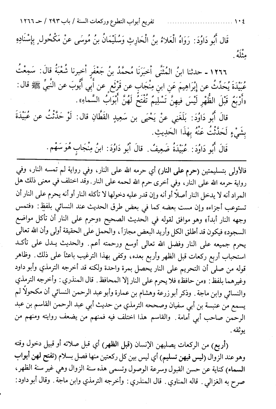 وَالْحَدِيثُ يَدُلُّ عَلَى تَأَكُّدِ اسْتِحْبَابِ أَرْبَعِ رَكَعَاتٍ قَبْلَ الظُّهْرِ وَأَرْبَعٍ بَعْدَهُ وَكَفَى بِهَذَا التَّرْغِيبِ بَاعِثًا عَلَى ذَلِكَ