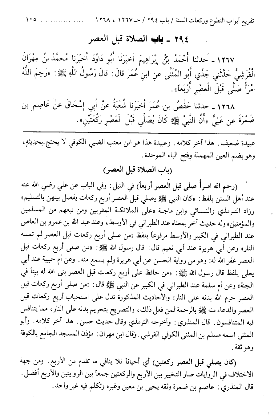 [1271] (رحم الله امرءا صَلَّى قَبْلَ الْعَصْرِ أَرْبَعًا) فِي النَّيْلِ وَفِي الْبَابِ عَنْ عَلِيٍّ رَضِيَ اللَّهُ عَنْهُ عِنْدَ أَهْلِ السُّنَنِ بِلَفْظِ كَانَ النَّبِيُّ صَلَّى اللَّهُ عَلَيْهِ وَسَلَّمَ يُصَلِّي قَبْلَ الْعَصْرِ أَرْبَعَ رَكَعَاتٍ يفصل بينهن بالتسليم وزاد الترمذي والنسائي وبن مَاجَهْ عَلَى الْمَلَائِكَةِ الْمُقَرَّبِينَ وَمَنْ تَبِعَهُمْ مِنَ الْمُسْلِمِينَ وَالْمُؤْمِنِينَ وَلَهُ حَدِيثٌ آخَرُ بِمَعْنَاهُ عِنْدَ الطَّبَرَانِيِّ فِي الْأَوْسَطِ وَعَنْ عَبْدِ اللَّهِ بْنِ عَمْرِو بْنِ الْعَاصِ عِنْدَ الطَّبَرَانِيِّ فِي الْكَبِيرِ وَالْأَوْسَطِ مَرْفُوعًا بِلَفْظِ مَنْ صَلَّى أَرْبَعَ رَكَعَاتٍ قَبْلَ الْعَصْرِ لَمْ تَمَسَّهُ النَّارُ وَعَنْ أَبِي هُرَيْرَةَ عِنْدَ أَبِي نُعَيْمٍ قَالَ قَالَ رَسُولُ اللَّهِ صَلَّى اللَّهُ عَلَيْهِ وَسَلَّمَ مَنْ صَلَّى أَرْبَعَ رَكَعَاتٍ قَبْلَ الْعَصْرِ غَفَرَ اللَّهُ لَهُ وَهُوَ مِنْ رِوَايَةِ الْحَسَنِ عَنْ أَبِي هُرَيْرَةَ وَلَمْ يُسْمَعْ مِنْهُ