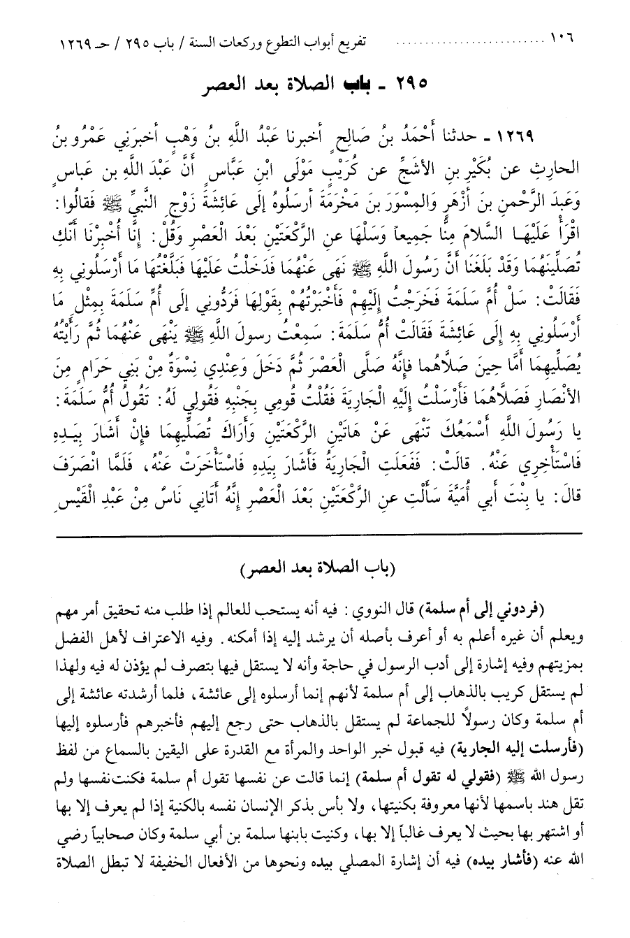 وفي الِاعْتِرَافُ لِأَهْلِ الْفَضْلِ بِمَزِيَّتِهِمْ وَفِيهِ إِشَارَةٌ إِلَى أَدَبِ الرَّسُولِ فِي حَاجَةٍ وَأَنَّهُ لَا يَسْتَقِلُّ فِيهَا بِتَصَرُّفٍ لَمْ يُؤْذَنْ لَهُ فِيهِ وَلِهَذَا لَمْ يَسْتَقِلَّ كُرَيْبٌ بِالذَّهَابِ إِلَى أُمِّ سَلَمَةَ لِأَنَّهُمْ إِنَّمَا أَرْسَلُوهُ إِلَى عَائِشَةَ فَلَمَّا أَرْشَدَتْهُ عَائِشَةُ إِلَى أُمِّ سَلَمَةَ وَكَانَ رَسُولًا لِلْجَمَاعَةِ لَمْ يَسْتَقِلَّ بِالذَّهَابِ حَتَّى رَجَعَ إِلَيْهِمْ فَأَخْبَرَهُمْ فَأَرْسَلُوهُ إِلَيْهَا (فَأَرْسَلَتْ إِلَيْهِ الْجَارِيَةُ) فِيهِ قَبُولُ خَبَرِ الْوَاحِدِ وَالْمَرْأَةِ مَعَ الْقُدْرَةِ عَلَى الْيَقِينِ بِالسَّمَاعِ مِنْ لَفْظِ رَسُولِ اللَّهِ صَلَّى اللَّهُ عَلَيْهِ وَسَلَّمَ (فَقُولِي لَهُ تَقُولُ أُمُّ سَلَمَةَ) إِنَّمَا قَالَتْ عَنْ نَفْسِهَا تَقُولُ أُمُّ سَلَمَةَ فَكَنَّتْ نَفْسَهَا وَلَمْ تَقُلْ هِنْدُ بِاسْمِهَا لِأَنَّهَا مَعْرُوفَةٌ بِكُنْيَتِهَا وَلَا بَأْسَ بِذِكْرِ الْإِنْسَانِ نَفْسَهُ بِالْكُنْيَةِ إِذَا لَمْ يُعْرَفْ إِلَّا بِهَا أَوِ اشْتُهِرَ بِهَا بِحَيْثُ لَا يُعْرَفُ غَالِبًا إِلَّا بِهَا وَكُنِّيَتْ بِابْنِهَا سَلَمَةَ بْنِ أَبِي سَلَمَةَ وَكَانَ صَحَابِيًّا رَضِيَ اللَّهُ عَنْهُ (فَأَشَارَ بِيَدِهِ) فِيهِ أَنَّ إِشَارَةَ الْمُصَلِّي بِيَدِهِ وَنَحْوِهَا مِنَ الْأَفْعَالِ الْخَفِيفَةِ لَا تُبْطِلُ الصَّلَاةَ