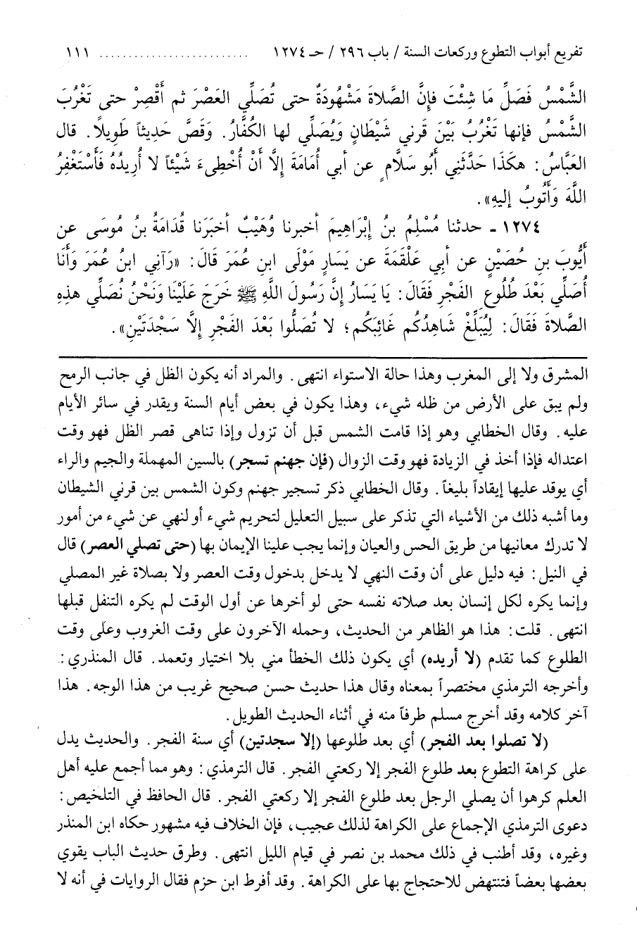 وَالْحَدِيثُ يَدُلُّ عَلَى كَرَاهَةِ التَّطَوُّعِ بَعْدَ طُلُوعِ الْفَجْرِ إِلَّا رَكْعَتَيِ الْفَجْرِ
