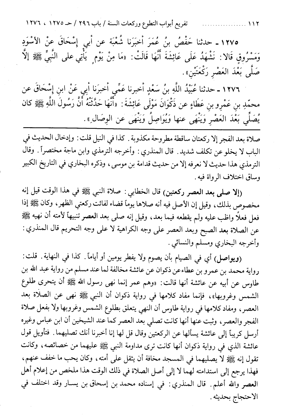 [1279] (إِلَّا صَلَّى بَعْدَ الْعَصْرِ رَكْعَتَيْنِ) قَالَ الْخَطَّابِيُّ صَلَاةُ النَّبِيِّ صَلَّى اللَّهُ عَلَيْهِ وَسَلَّمَ فِي هَذَا الْوَقْتِ قِيلَ إِنَّهُ مَخْصُوصٌ بِذَلِكَ وَقِيلَ إِنَّ الْأَصْلَ فِيهِ أَنَّهُ صَلَّاهَا يَوْمًا قَضَاءً لِفَائِتِ رَكْعَتَيِ الظُّهْرِ وَكَانَ صَلَّى اللَّهُ عَلَيْهِ وَسَلَّمَ إِذَا فَعَلَ فِعْلًا وَاظَبَ عَلَيْهِ وَلَمْ يَقْطَعْهُ فِيمَا بَعْدُ وَقِيلَ إِنَّهُ صَلَّى بَعْدَ الْعَصْرِ تَنْبِيهًا لِأُمَّتِهِ أَنَّ نَهْيَهُ صَلَّى اللَّهُ عَلَيْهِ وَسَلَّمَ عَنِ الصَّلَاةِ بَعْدَ الصُّبْحِ وَبَعْدَ الْعَصْرِ عَلَى وَجْهِ الْكَرَاهِيَةِ لَا عَلَى وَجْهِ التَّحْرِيمِ قَالَ الْمُنْذِرِيُّ وَأَخْرَجَهُ الْبُخَارِيُّ وَمُسْلِمٌ وَالنَّسَائِيُّ