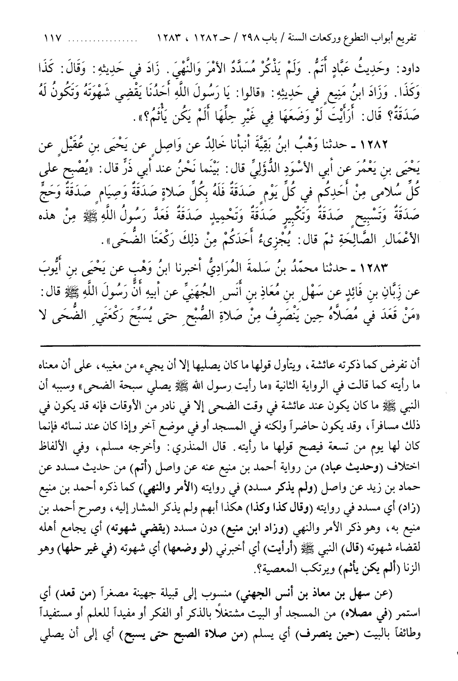 قَالَ الْمُنْذِرِيُّ وَأَخْرَجَهُ مُسْلِمٌ وَفِي الْأَلْفَاظِ اخْتِلَافٌ (وَحَدِيثُ عَبَّادٍ) مِنْ رِوَايَةِ أَحْمَدَ بْنِ مَنِيعٍ عَنْهُ عَنْ وَاصِلٍ (أَتَمُّ) مِنْ حَدِيثِ مُسَدَّدٍ عَنْ حَمَّادِ بْنِ زَيْدٍ عَنْ وَاصِلٍ (وَلَمْ يُذْكَرْ مُسَدَّدٌ) فِي رِوَايَتِهِ (الْأَمْرُ وَالنَّهْيُ) كَمَا ذَكَرَهُ أَحْمَدُ بْنُ مَنِيعٍ (زَادَ) أَيْ مُسَدَّدٌ فِي رِوَايَتِهِ (وَقَالَ كَذَا وَكَذَا) هَكَذَا أُبْهِمَ وَلَمْ يَذْكُرِ الْمُشَارَ إِلَيْهِ وَصَرَّحَ أَحْمَدُ بْنُ مَنِيعٍ به وهو ذكر الأمر والنهي (وزاد بن مَنِيعٍ) دُونَ مُسَدَّدٍ (يَقْضِي شَهْوَتَهُ) أَيْ يُجَامِعُ أَهْلَهُ لِقَضَاءِ شَهْوَتِهِ (قَالَ) النَّبِيُّ صَلَّى اللَّهُ عَلَيْهِ وَسَلَّمَ (أَرَأَيْتَ) أَيْ أَخْبِرْنِي (لَوْ وَضَعَهَا) أي شهوته (في غير حلها) وهو الزنى (ألم يكن يأثم) ويرتكب المعصية